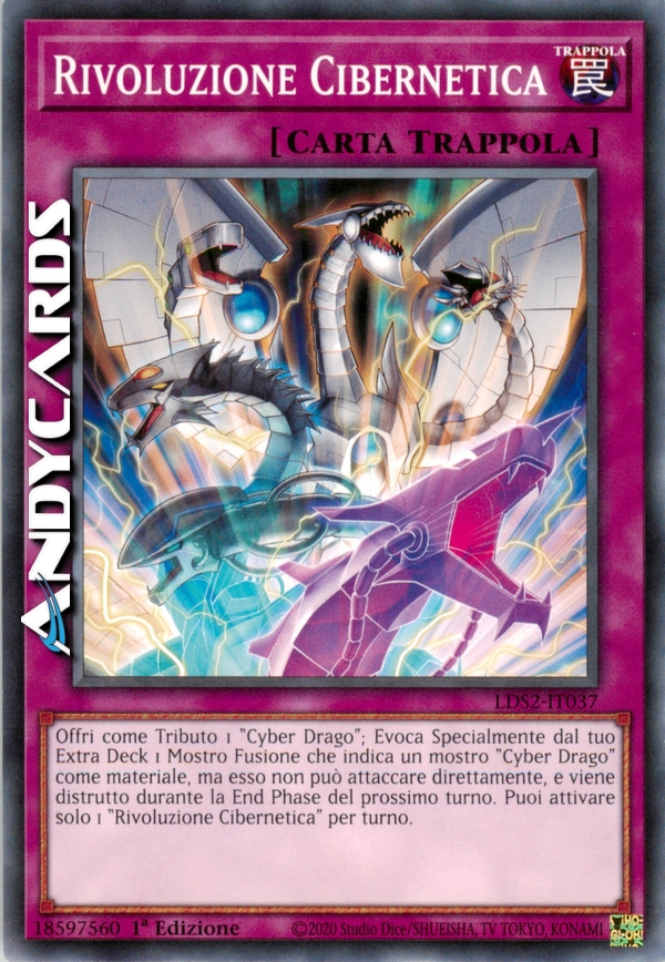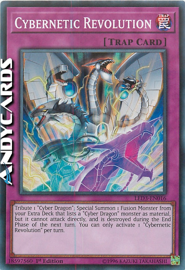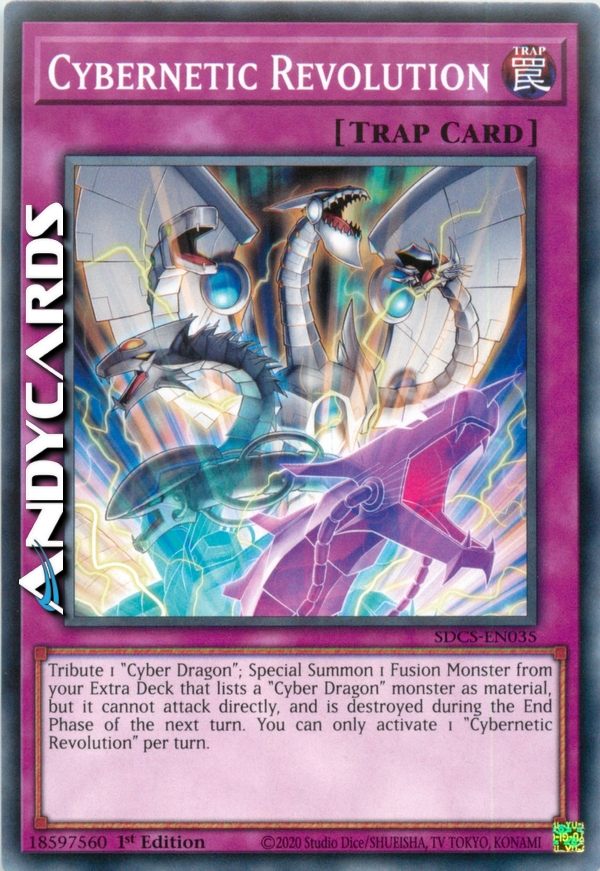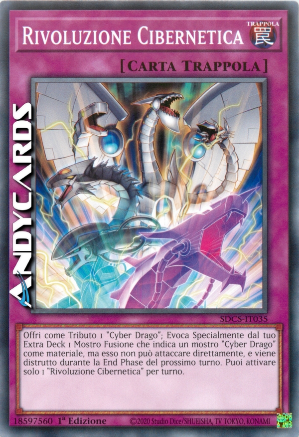 Offri come Tributo 1 "Cyber Drago"; Evoca Specialmente dal tuo Extra Deck 1 Mostro Fusione che indica un mostro "Cyber Drago" come materiale, ma esso non può attaccare direttamente, e viene distrutto durante la End Phase del prossimo turno. Puoi attivare solo 1 "Rivoluzione Cibernetica" per turno.