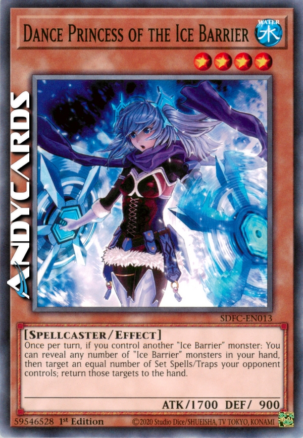 Una volta per turno, se controlli un altro mostro "Barriera di Ghiaccio" scoperto, puoi rivelare un qualsiasi numero di mostri "Barriera di Ghiaccio" nella tua mano per scegliere un ugual numero di Carte Magia/Trappola Posizionate controllate dal tuo avversario. Fai ritornare le Carte Magia/Trappola Posizionate scelte controllate dal tuo avversario nella mano.
