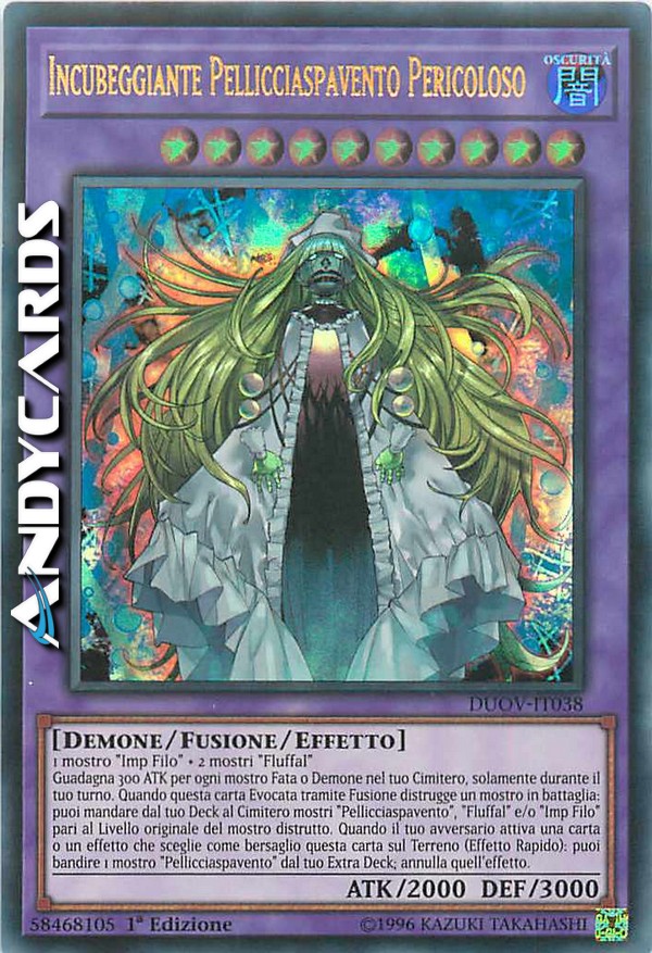 Guadagna 300 ATK per ogni mostro Fata o Demone nel tuo Cimitero, solamente durante il tuo turno. Quando questa carta Evocata tramite Fusione distrugge un mostro in battaglia: puoi mandare dal tuo Deck al Cimitero mostri "Pellicciaspavento", "Fluffal" e/o "Imp Filo" pari al Livello originale del mostro distrutto. Quando il tuo avversario attiva una carta o un effetto che sceglie come bersaglio questa carta sul Terreno (Effetto Rapido): puoi bandire 1 mostro "Pellicciaspavento" dal tuo Extra Deck; annulla quell'effetto.