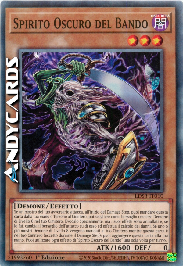 Se un mostro del tuo avversario attacca, all'inizio del Damage Step: puoi mandare questa carta dalla tua mano o Terreno al Cimitero, poi scegliere come bersaglio 1 mostro Demone di Livello 8 nel tuo Cimitero; Evocalo Specialmente, ma i suoi effetti sono annullati e, se lo fai, cambia il bersaglio dell'attacco su di esso ed effettua il calcolo dei danni. Se uno o più mostri Demone di Livello 8 vengono mandati al tuo Cimitero mentre questa carta è nel tuo Cimitero (eccetto durante il Damage Step): puoi aggiungere questa carta alla tua mano. Puoi utilizzare ogni effetto di "Spirito Oscuro del Bando" una sola volta per turno.