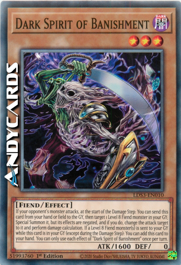 If your opponent's monster attacks, at the start of the Damage Step: You can send this card from your hand or field to the GY, then target 1 Level 8 Fiend monster in your GY; Special Summon it, but its effects are negated, and if you do, change the attack target to it and perform damage calculation. If a Level 8 Fiend monster(s) is sent to your GY while this card is in your GY (except during the Damage Step): You can add this card to your hand. You can only use each effect of "Dark Spirit of Banishment" once per turn.