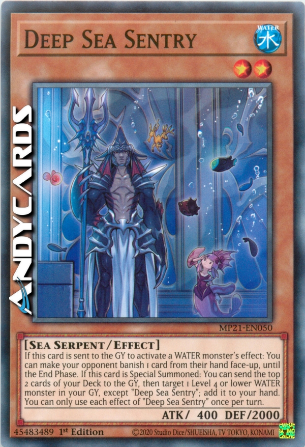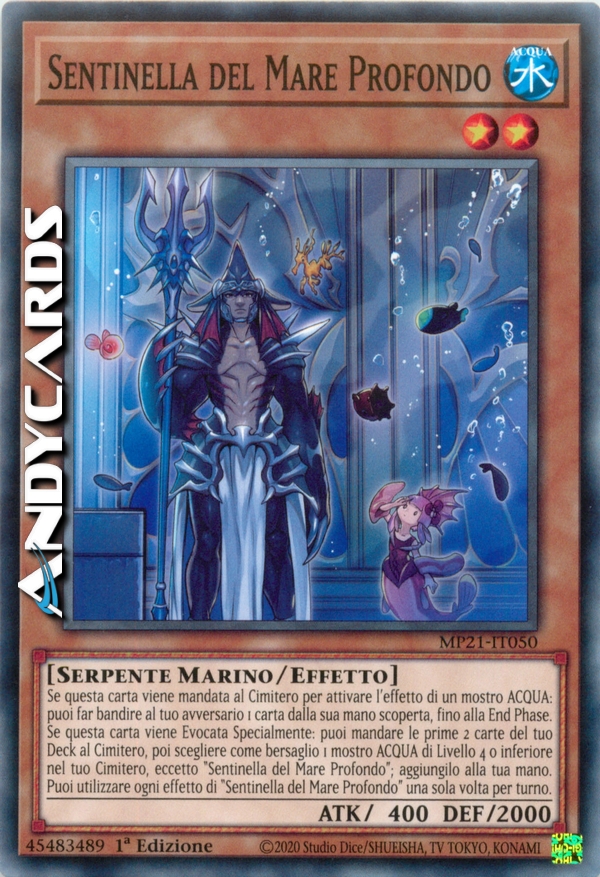 Se questa carta viene mandata al Cimitero per attivare l'effetto di un mostro ACQUA: puoi far bandire al tuo avversario 1 carta dalla sua mano scoperta, fino alla End Phase. Se questa carta viene Evocata Specialmente: puoi mandare le prime 2 carte del tuo Deck al Cimitero, poi scegliere come bersaglio 1 mostro ACQUA di Livello 4 o inferiore nel tuo Cimitero, eccetto "Sentinella del Mare Profondo"; aggiungilo alla tua mano. Puoi utilizzare ogni effetto di "Sentinella del Mare Profondo" una sola volta per turno.