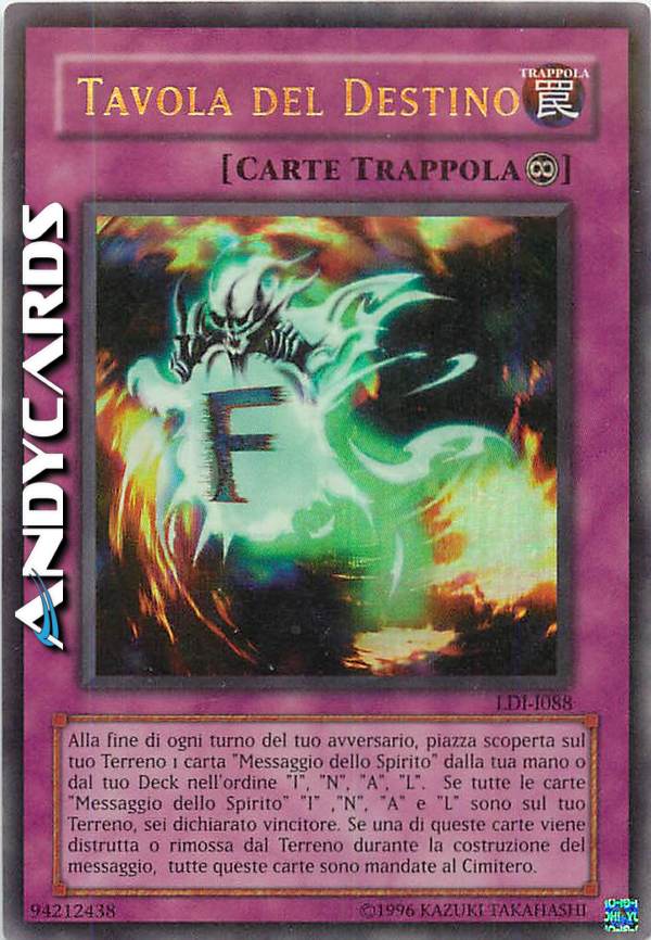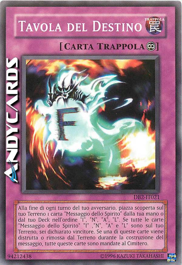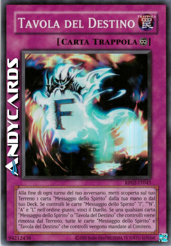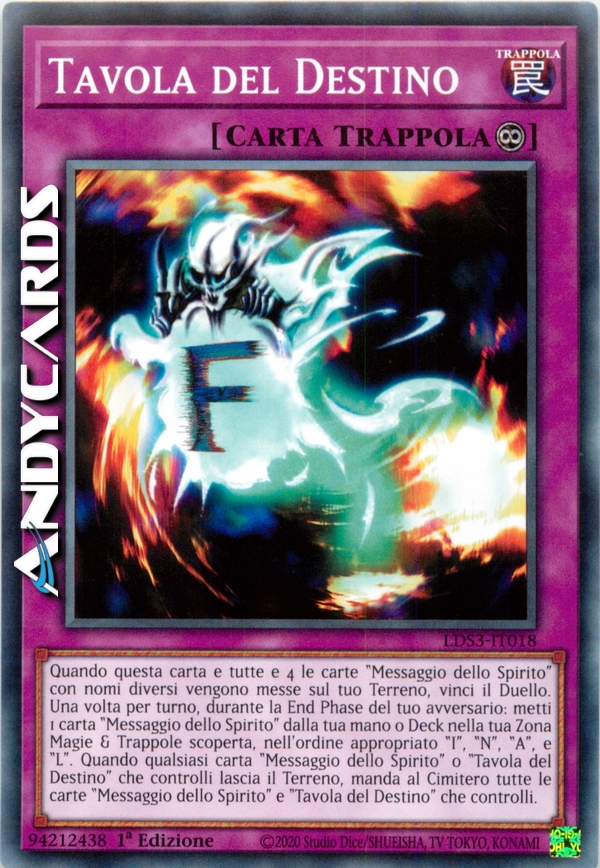 Quando questa carta e tutte e 4 le carte "Messaggio dello Spirito" con nomi diversi vengono messe sul tuo Terreno, vinci il Duello. Una volta per turno, durante la End Phase del tuo avversario: metti 1 carta "Messaggio dello Spirito" dalla tua mano o Deck nella tua Zona Magie & Trappole scoperta, nell'ordine appropriato "I", "N", "A", e "L". Quando qualsiasi carta "Messaggio dello Spirito" o "Tavola del Destino" che controlli lascia il Terreno, manda al Cimitero tutte le carte "Messaggio dello Spirito" e "Tavola del Destino" che controlli.