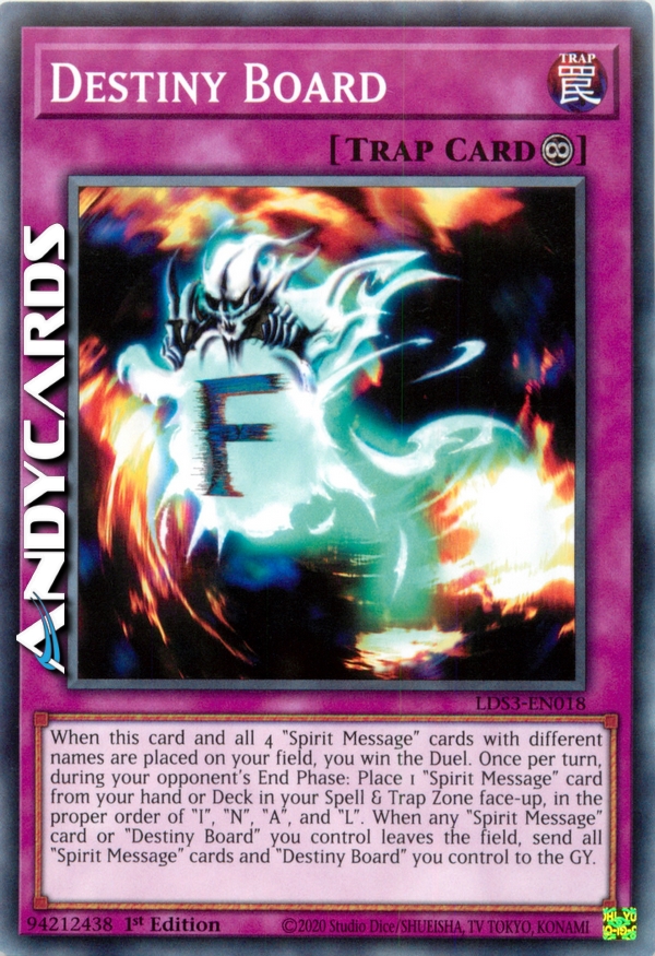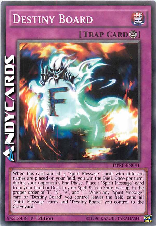 When this card and all 4 "Spirit Message" cards with different names are placed on your field, you win the Duel. Once per turn, during your opponent's End Phase: Place 1 "Spirit Message" card from your hand or Deck in your Spell & Trap Zone face-up, in the proper order of "I", "N", "A", and "L". When any "Spirit Message" card or "Destiny Board" you control leaves the field, send all "Spirit Message" cards and "Destiny Board" you control to the GY.