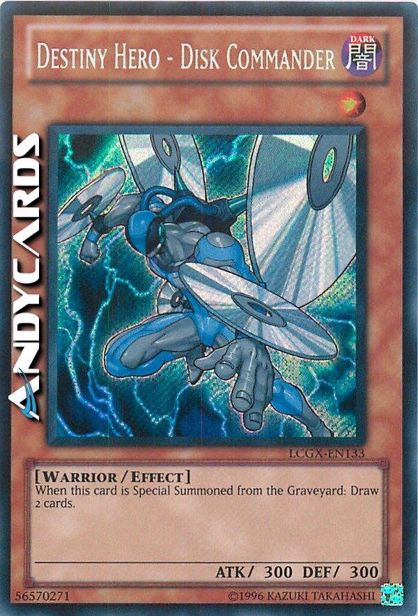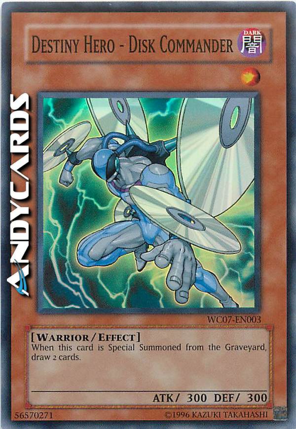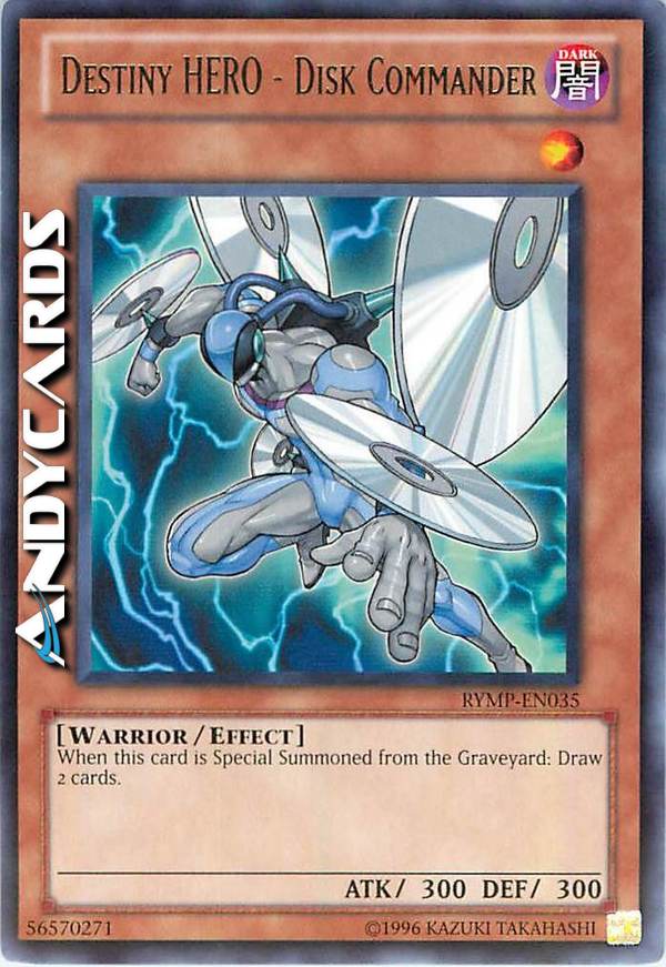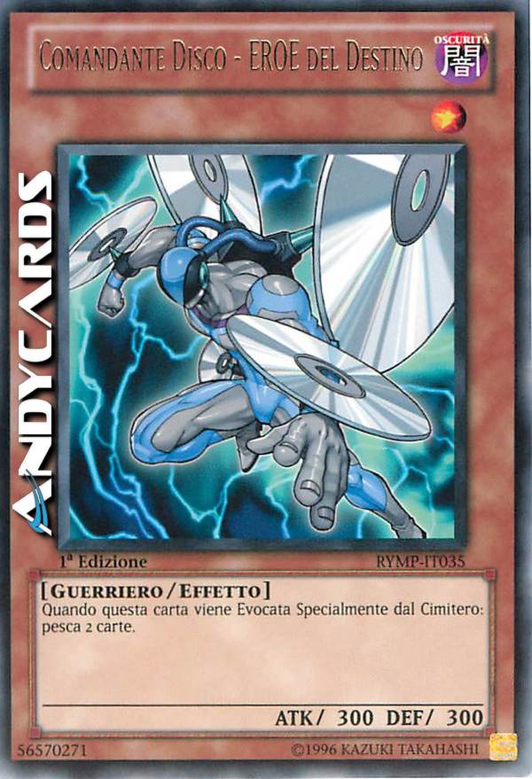 Non può essere Evocato Specialmente dal Cimitero nel turno in cui questa carta è stata mandata al Cimitero. Se questa carta viene Evocata Specialmente dal Cimitero: puoi pescare 2 carte. Puoi utilizzare questo effetto di "Comandante Disco - EROE del Destino" una sola volta per Duello.