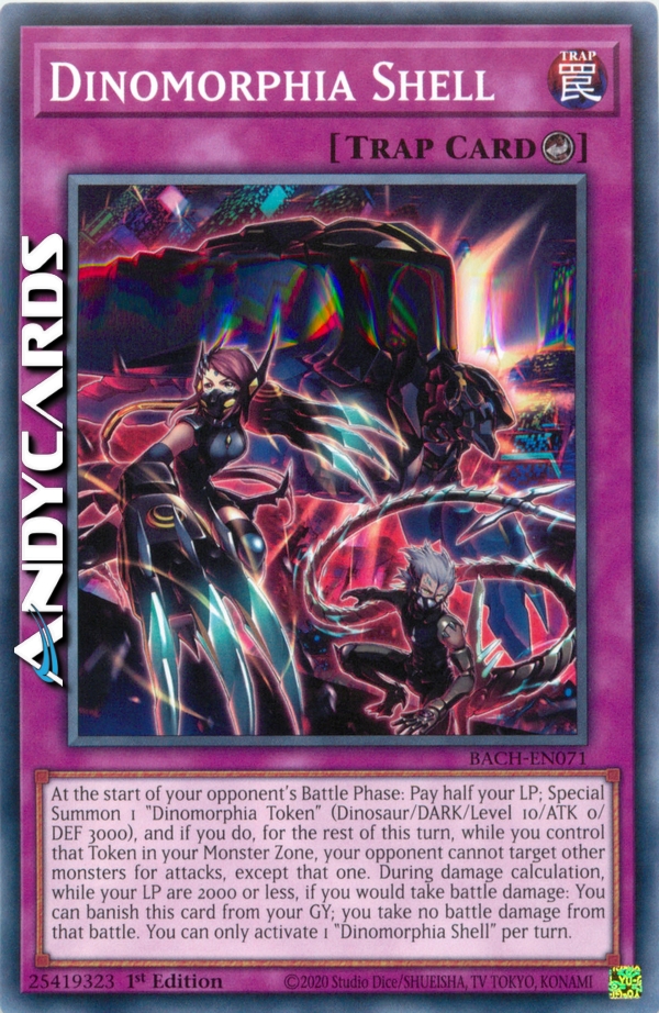 At the start of your opponent's Battle Phase: Pay half your LP; Special Summon 1 "Dinomorphia Token" (Dinosaur/DARK/Level 10/ATK 0/DEF 3000), and if you do, for the rest of this turn, while you control that Token in your Monster Zone, your opponent cannot target other monsters for attacks, except that one. During damage calculation, while your LP are 2000 or less, if you would take battle damage: You can banish this card from your GY; you take no battle damage from that battle. You can only activate 1 "Dinomorphia Shell" per turn.