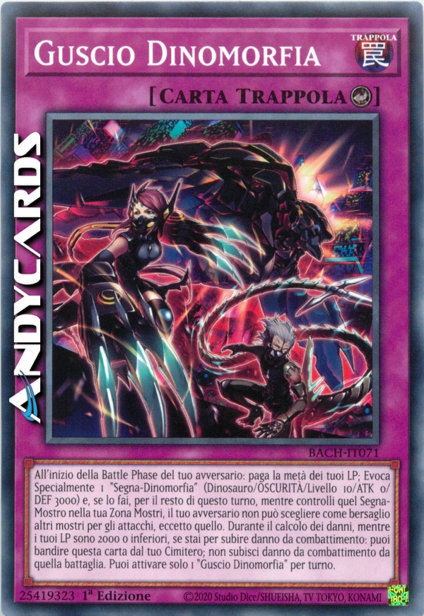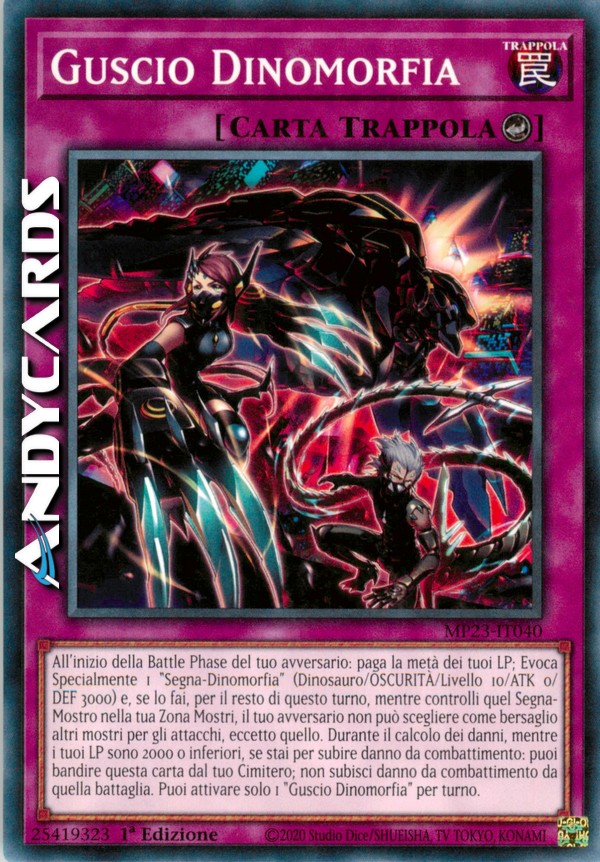 All'inizio della Battle Phase del tuo avversario: paga la metà dei tuoi LP; Evoca Specialmente 1 "Segna-Dinomorfia" (Dinosauro/OSCURITÀ/Livello 10/ATK 0/DEF 3000) e, se lo fai, per il resto di questo turno, mentre controlli quel Segna-Mostro nella tua Zona Mostri, il tuo avversario non può scegliere come bersaglio altri mostri per gli attacchi, eccetto quello. Durante il calcolo dei danni, mentre i tuoi LP sono 2000 o inferiori, se stai per subire danno da combattimento: puoi bandire questa carta dal tuo Cimitero; non subisci danno da combattimento da quella battaglia. Puoi attivare solo 1 "Guscio Dinomorfia" per turno.