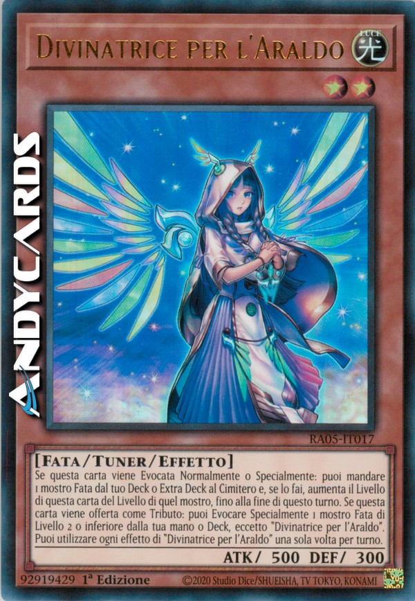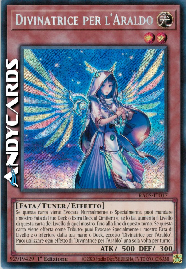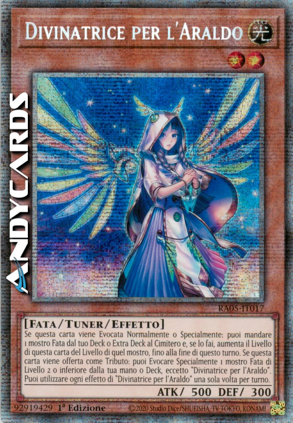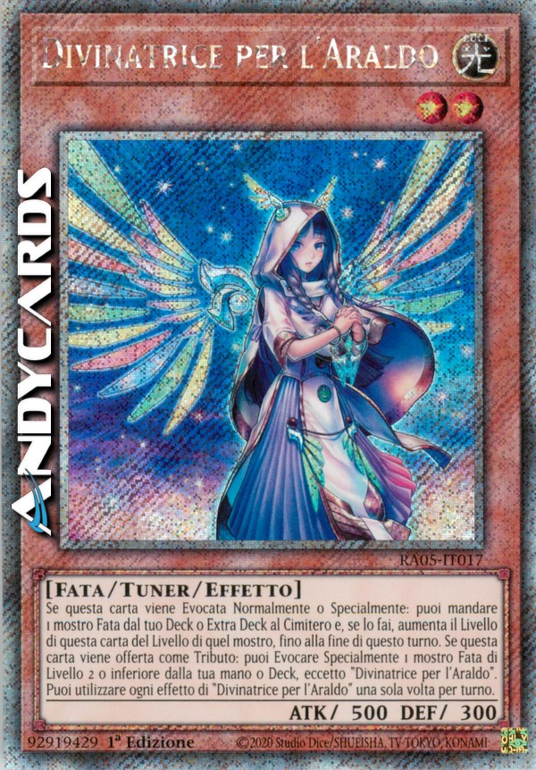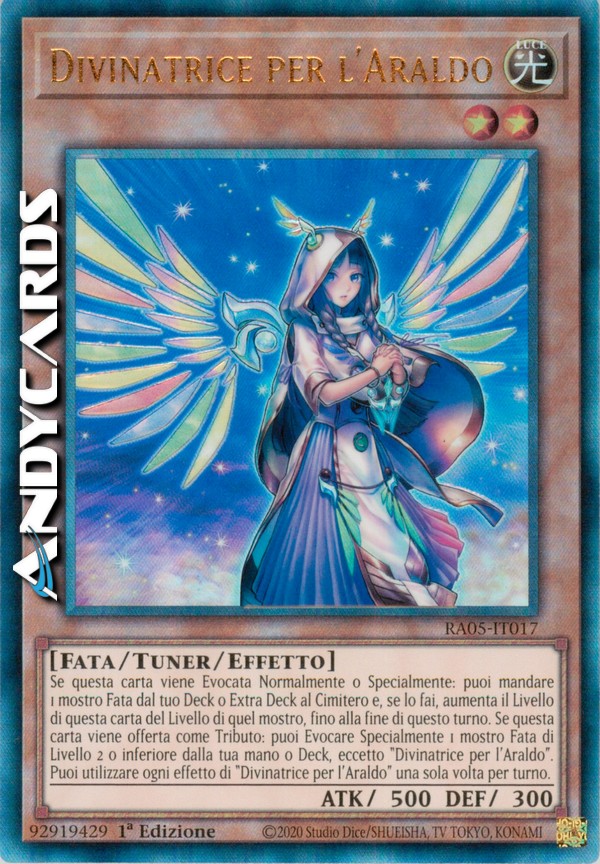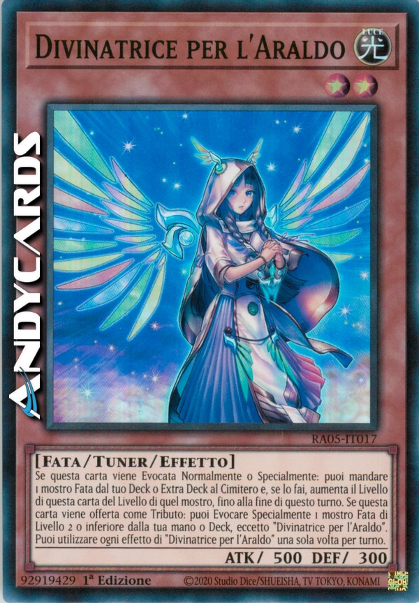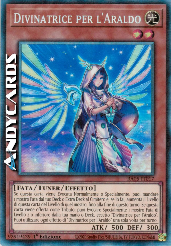 Se questa carta viene Evocata Normalmente o Specialmente: puoi mandare 1 mostro Fata dal tuo Deck o Extra Deck al Cimitero e, se lo fai, aumenta il Livello di questa carta del Livello di quel mostro, fino alla fine di questo turno. Se questa carta viene offerta come Tributo: puoi Evocare Specialmente 1 mostro Fata di Livello 2 o inferiore dalla tua mano o Deck, eccetto "Divinatrice per l'Araldo". Puoi utilizzare ogni effetto di "Divinatrice per l'Araldo" una sola volta per turno.