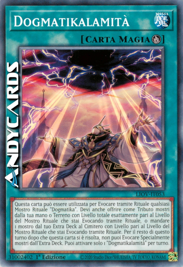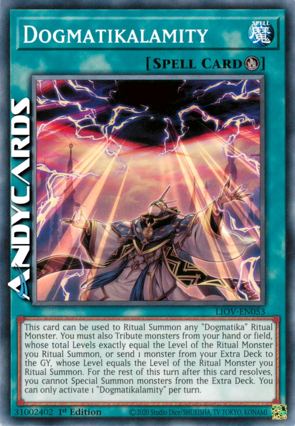 This card can be used to Ritual Summon any "Dogmatika" Ritual Monster. You must also Tribute monsters from your hand or field, whose total Levels exactly equal the Level of the Ritual Monster you Ritual Summon, or send 1 monster from your Extra Deck to the GY, whose Level equals the Level of the Ritual Monster you Ritual Summon. For the rest of this turn after this card resolves, you cannot Special Summon monsters from the Extra Deck. You can only activate 1 "Dogmatikalamity" per turn.