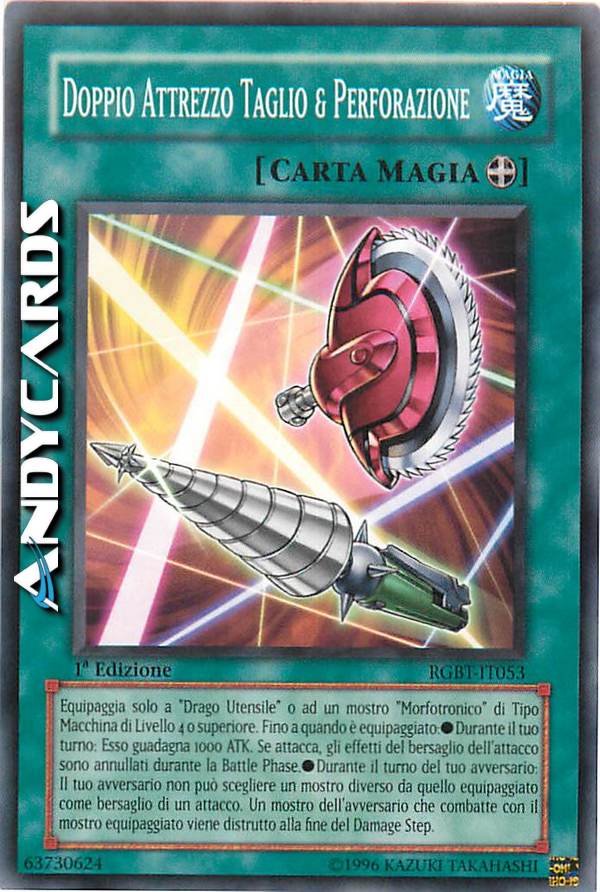 Equipaggia solo a "Drago Utensile" o ad un mostro "Morfotronico" di Tipo Macchina di Livello 4 o superiore. Fino a quando è equipaggiato:- Durante il tuo turno: Esso guadagna 1000 ATK. Se attacca, gli effetti del bersaglio dell'attacco sono annullati durante la Battle Phase. - Durante il turno dell'avversario: Il tuo avversario non può scegliere un mostro diverso da quello equipaggiato come bersaglio di un attacco. Un mostro dell'avversario che combatte con il mostro equipaggiato viene distrutto alla fine del Damage Step.