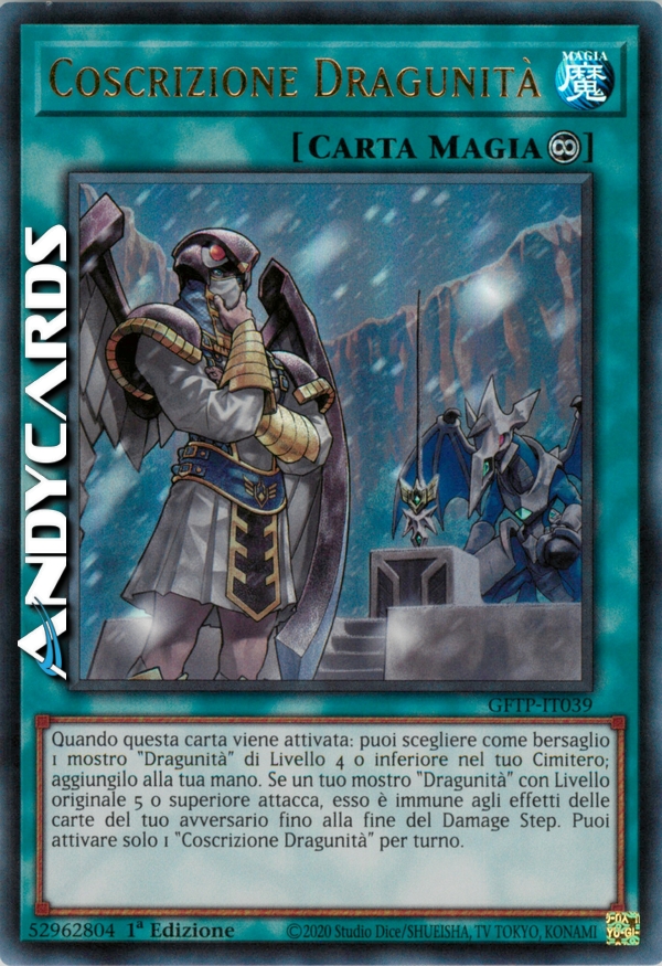 Quando questa carta viene attivata: puoi scegliere come bersaglio 1 mostro "Dragunità" di Livello 4 o inferiore nel tuo Cimitero; aggiungilo alla tua mano. Se un tuo mostro "Dragunità" con Livello originale 5 o superiore attacca, esso è immune agli effetti delle carte del tuo avversario fino alla fine del Damage Step. Puoi attivare solo 1 "Coscrizione Dragunità" per turno.