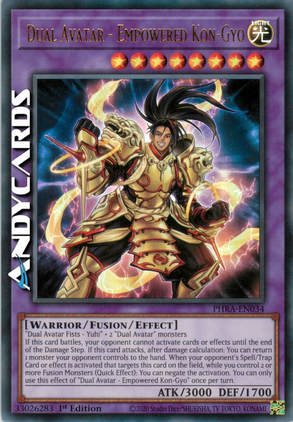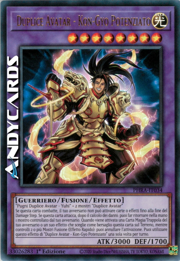 Se questa carta combatte, il tuo avversario non può attivare carte o effetti fino alla fine del Damage Step. Se questa carta attacca, dopo il calcolo dei danni: puoi far ritornare nella mano 1 mostro controllato dal tuo avversario. Quando viene attivata una Carta Magia/Trappola del tuo avversario o un suo effetto che sceglie come bersaglio questa carta sul Terreno, mentre controlli 2 o più Mostri Fusione (Effetto Rapido): puoi annullare l'attivazione. Puoi utilizzare questo effetto di "Duplice Avatar - Kon-Gyo Potenziato" una sola volta per turno.