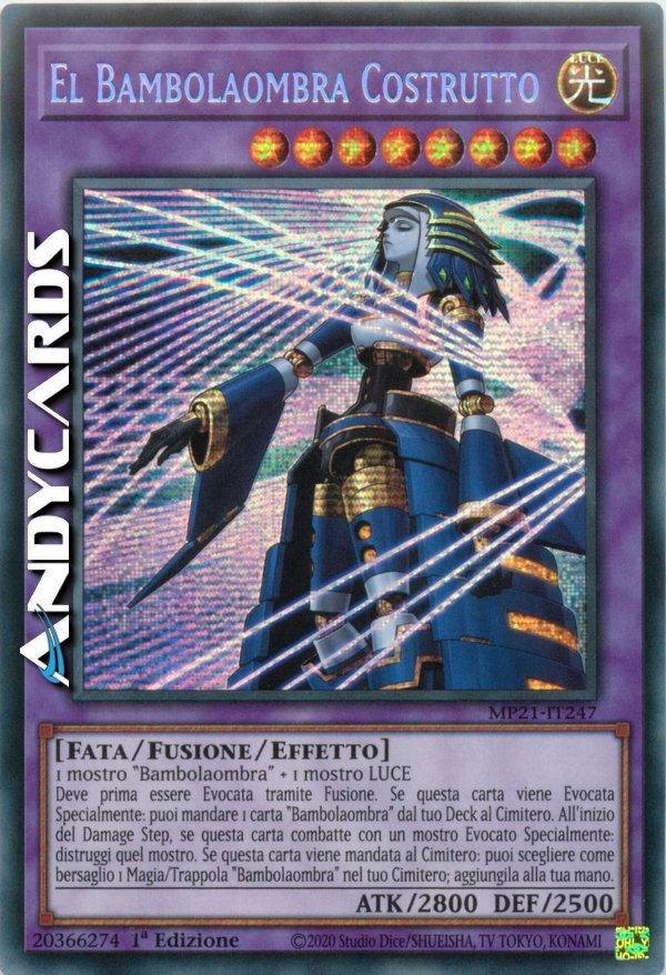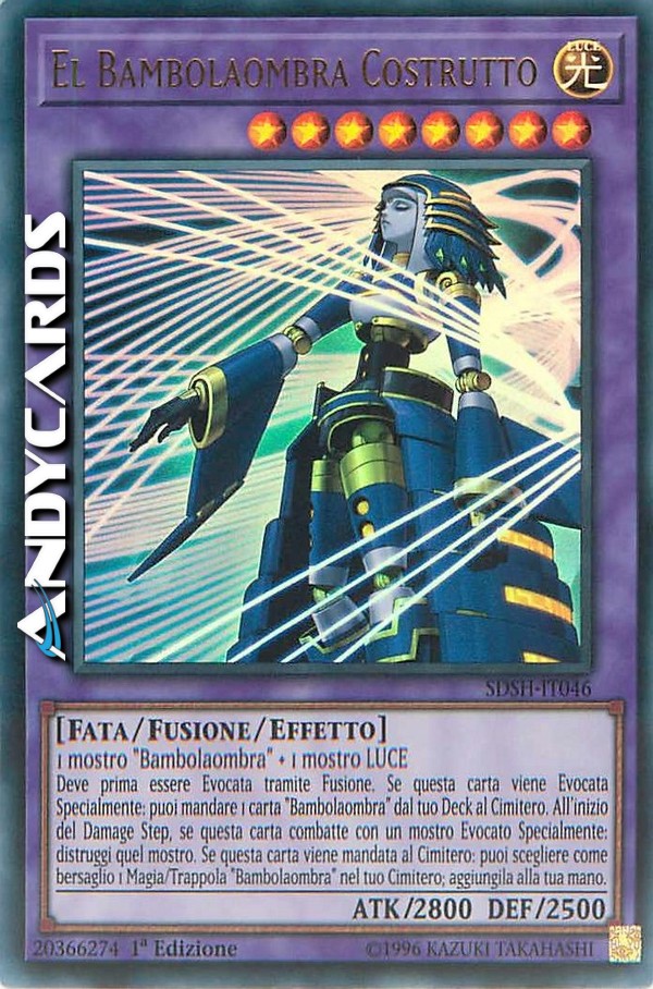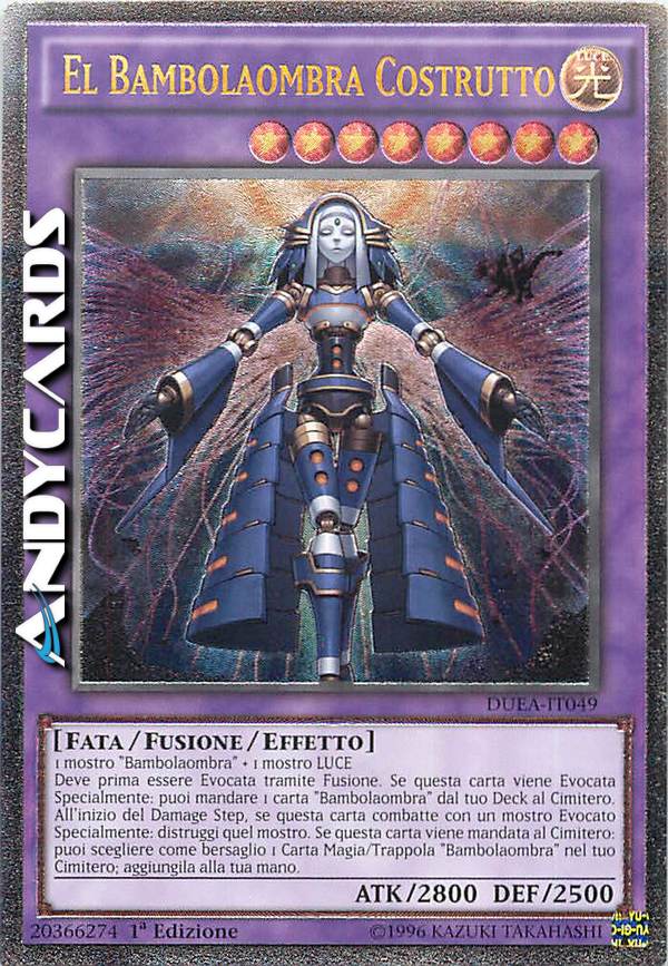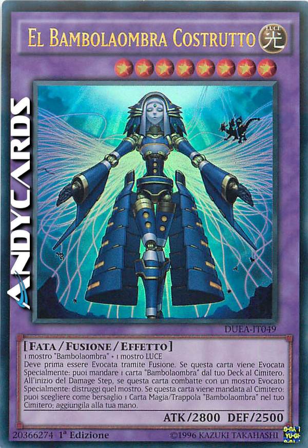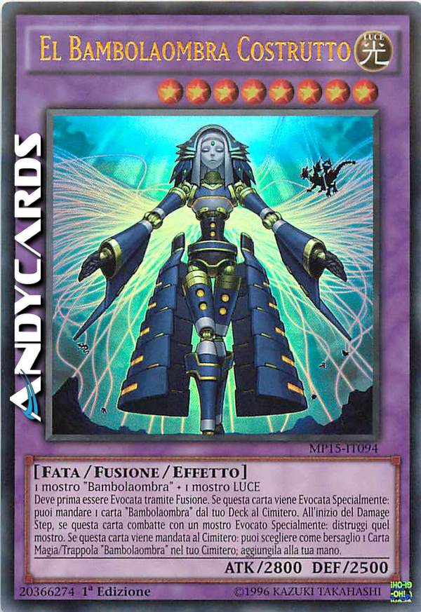 Deve prima essere Evocata tramite Fusione. Se questa carta viene Evocata Specialmente: puoi mandare 1 carta "Bambolaombra" dal tuo Deck al Cimitero. All'inizio del Damage Step, se questa carta combatte con un mostro Evocato Specialmente: distruggi quel mostro. Se questa carta viene mandata al Cimitero: puoi scegliere come bersaglio 1 carta Magia/Trappola "Bambolaombra" nel tuo Cimitero; aggiungila alla tua mano.