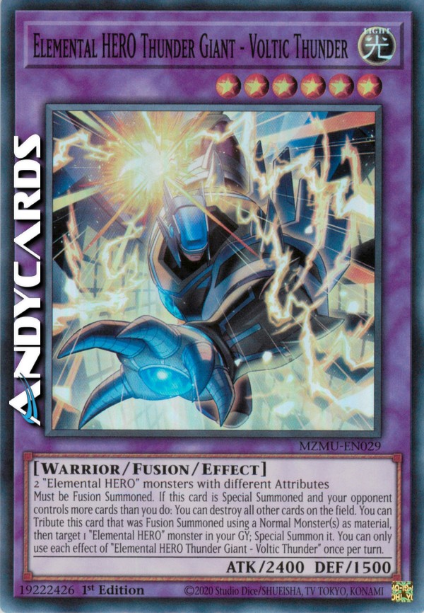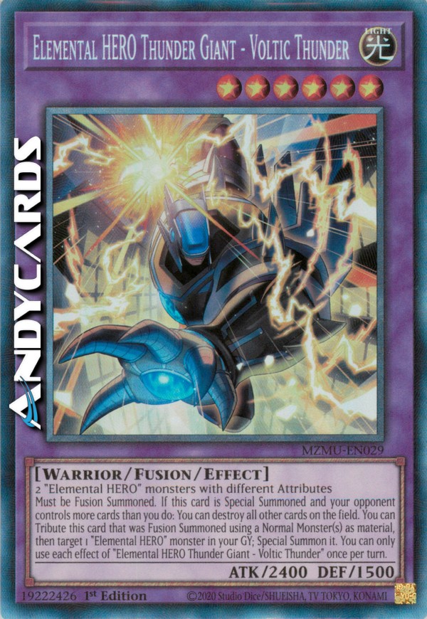 Must be Fusion Summoned. If this card is Special Summoned and your opponent controls more cards than you do: You can destroy all other cards on the field. You can Tribute this card that was Fusion Summoned using a Normal Monster(s) as material, then target 1 "Elemental HERO" monster in your GY; Special Summon it. You can only use each effect of "Elemental HERO Thunder Giant - Voltic Thunder" once per turn.