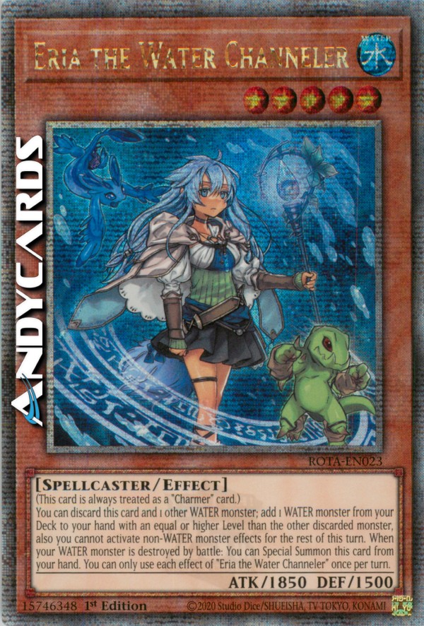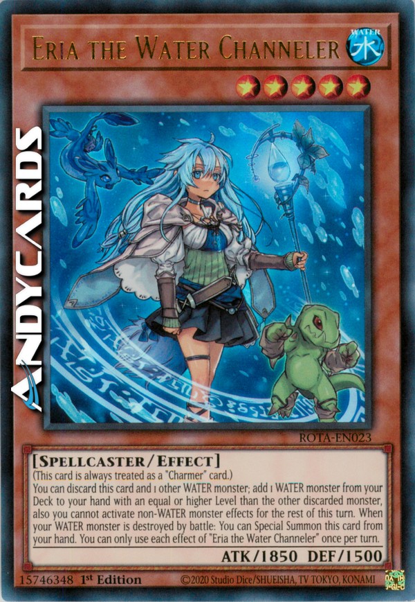 Puoi scartare questa carta e 1 altro mostro ACQUA; aggiungi dal tuo Deck alla tua mano 1 mostro ACQUA con Livello pari o superiore a quello dell'altro mostro scartato, inoltre non puoi attivare gli effetti dei mostri non-ACQUA per il resto di questo turno. Quando un tuo mostro ACQUA viene distrutto in battaglia: puoi Evocare Specialmente questa carta dalla tua mano. Puoi utilizzare ogni effetto di "Eria l'Incanalatrice dell'Acqua" una sola volta per turno.