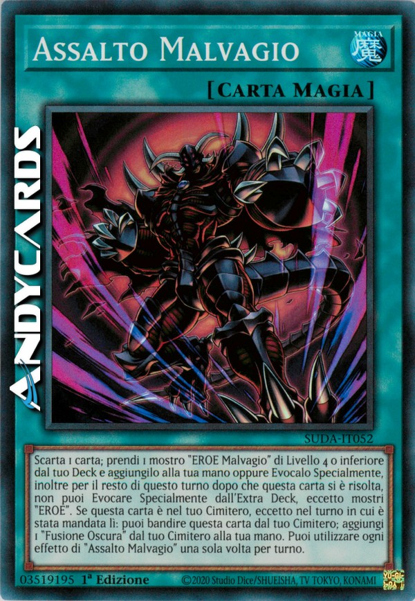 Scarta 1 carta; prendi 1 mostro "EROE Malvagio" di Livello 4 o inferiore dal tuo Deck e aggiungilo alla tua mano oppure Evocalo Specialmente, inoltre per il resto di questo turno dopo che questa carta si è risolta, non puoi Evocare Specialmente dall'Extra Deck, eccetto mostri "EROE". Se questa carta è nel tuo Cimitero, eccetto nel turno in cui è stata mandata lì: puoi bandire questa carta dal tuo Cimitero; aggiungi 1 "Fusione Oscura" dal tuo Cimitero alla tua mano. Puoi utilizzare ogni effetto di "Assalto Malvagio" una sola volta per turno.
