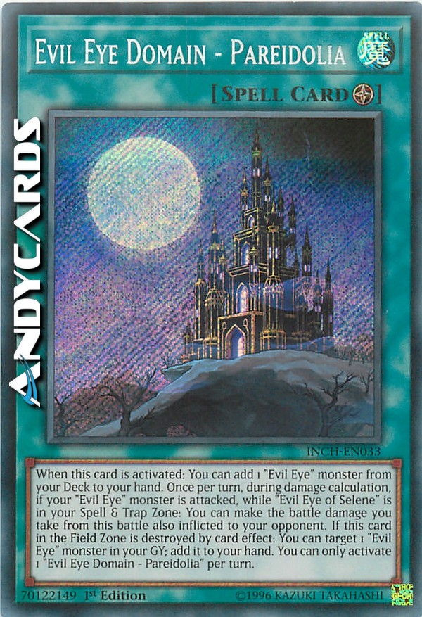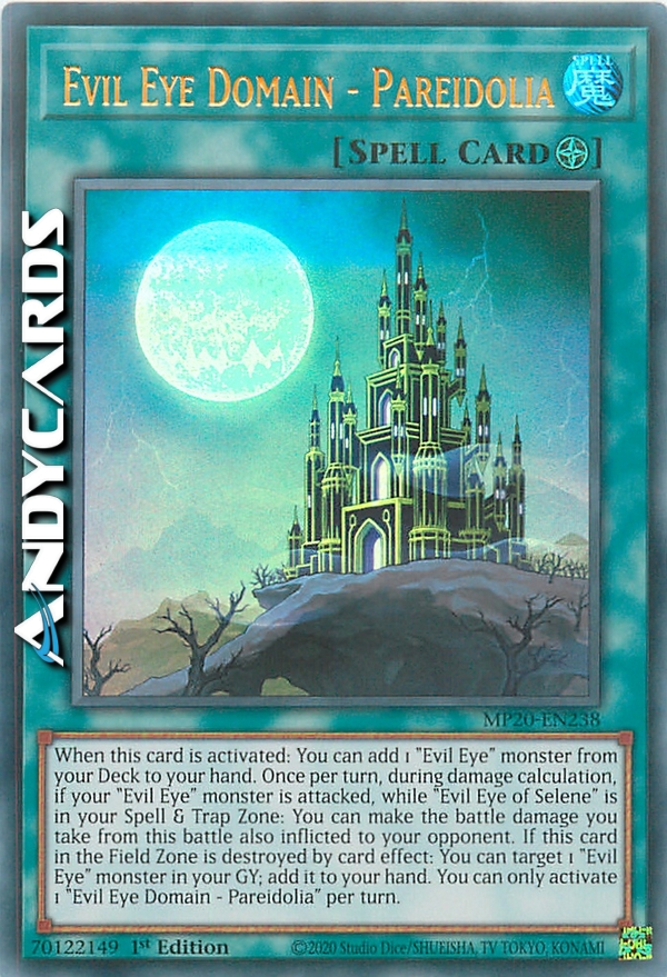 When this card is activated: You can add 1 "Evil Eye" monster from your Deck to your hand. Once per turn, during damage calculation, if your "Evil Eye" monster is attacked, while "Evil Eye of Selene" is in your Spell & Trap Zone: You can make the battle damage you take from this battle also inflicted to your opponent. If this card in the Field Zone is destroyed by card effect: You can target 1 "Evil Eye" monster in your GY; add it to your hand. You can only activate 1 "Evil Eye Domain - Pareidolia" per turn.