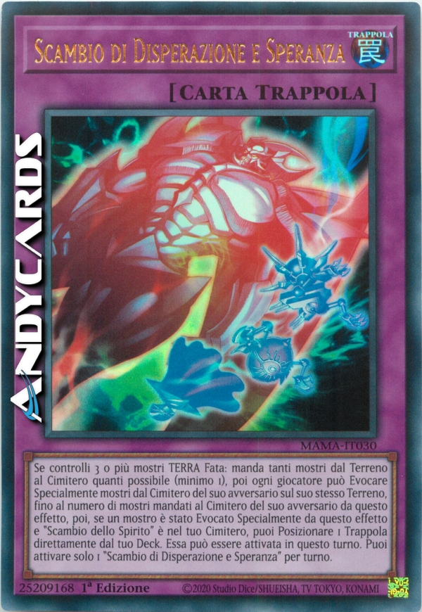 Se controlli 3 o più mostri TERRA Fata: manda tanti mostri dal Terreno al Cimitero quanti possibile (minimo 1), poi ogni giocatore può Evocare Specialmente mostri dal Cimitero del suo avversario sul suo stesso Terreno, fino al numero di mostri mandati al Cimitero del suo avversario da questo effetto, poi, se un mostro è stato Evocato Specialmente da questo effetto e "Scambio dello Spirito" è nel tuo Cimitero, puoi Posizionare 1 Trappola direttamente dal tuo Deck. Essa può essere attivata in questo turno. Puoi attivare solo 1 "Scambio di Disperazione e Speranza" per turno.