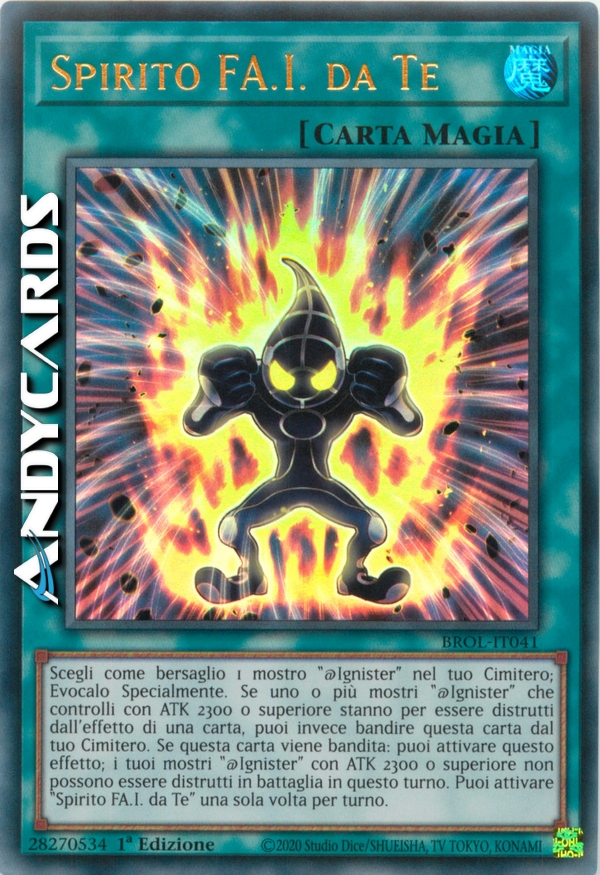 Scegli come bersaglio 1 mostro "@Ignister" nel tuo Cimitero; Evocalo Specialmente. Se uno o più mostri "@Ignister" che controlli con ATK 2300 o superiore stanno per essere distrutti dall'effetto di una carta, puoi invece bandire questa carta dal tuo Cimitero. Se questa carta viene bandita: puoi attivare questo effetto; i tuoi mostri "@Ignister" con ATK 2300 o superiore non possono essere distrutti in battaglia in questo turno. Puoi attivare "Spirito FA.I. da Te" una sola volta per turno.