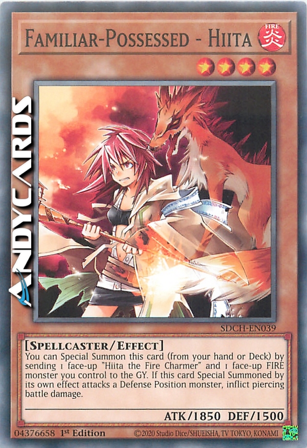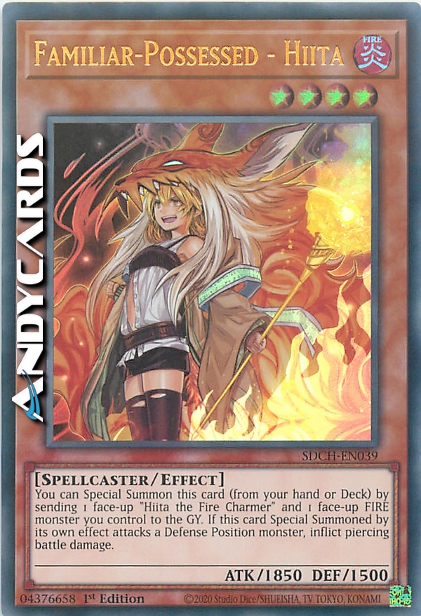 You can Special Summon this card (from your hand or Deck) by sending 1 face-up "Hiita the Fire Charmer" and 1 face-up FIRE monster you control to the GY. If this card Special Summoned by its effect attacks a Defense Position monster, inflict piercing battle damage to your opponent.