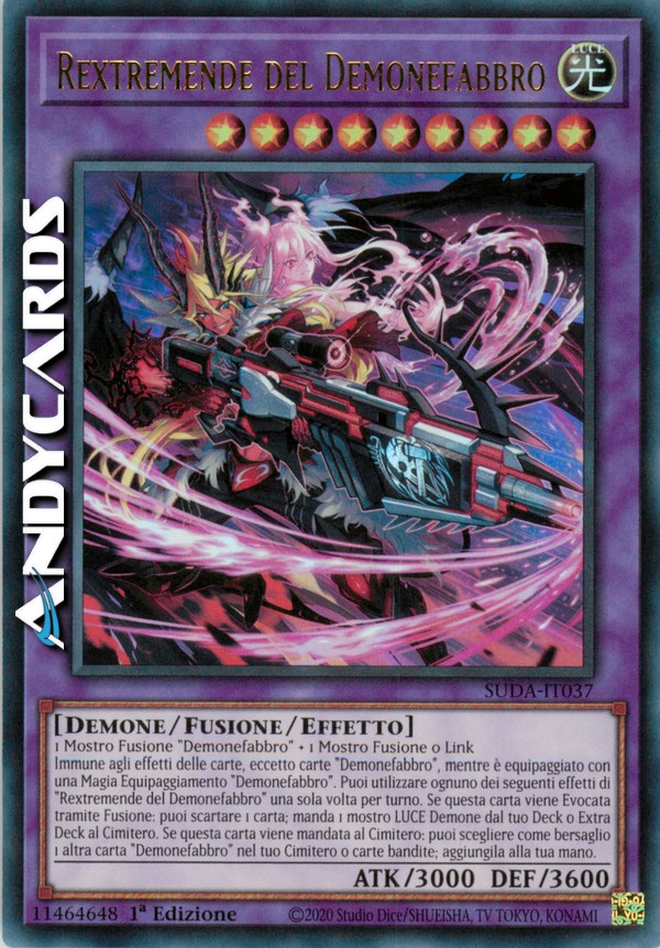 Immune agli effetti delle carte, eccetto carte "Demonefabbro", mentre è equipaggiato con una Magia Equipaggiamento "Demonefabbro". Puoi utilizzare ognuno dei seguenti effetti di "Rextremende del Demonefabbro" una sola volta per turno. Se questa carta viene Evocata tramite Fusione: puoi scartare 1 carta; manda 1 mostro LUCE Demone dal tuo Deck o Extra Deck al Cimitero. Se questa carta viene mandata al Cimitero: puoi scegliere come bersaglio 1 altra carta "Demonefabbro" nel tuo Cimitero o carte bandite; aggiungila alla tua mano.