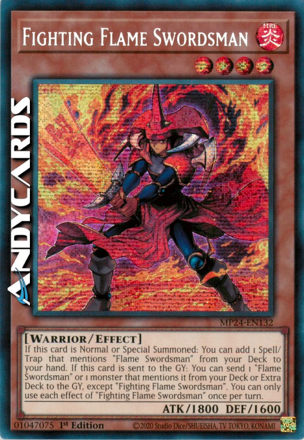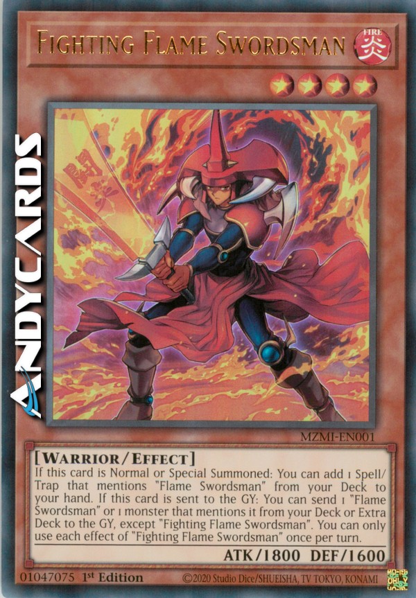 If this card is Normal or Special Summoned: You can add 1 Spell/Trap that mentions "Flame Swordsman" from your Deck to your hand. If this card is sent to the GY: You can send 1 "Flame Swordsman" or 1 monster that mentions it from your Deck or Extra Deck to the GY, except "Fighting Flame Swordsman". You can only use each effect of "Fighting Flame Swordsman" once per turn.