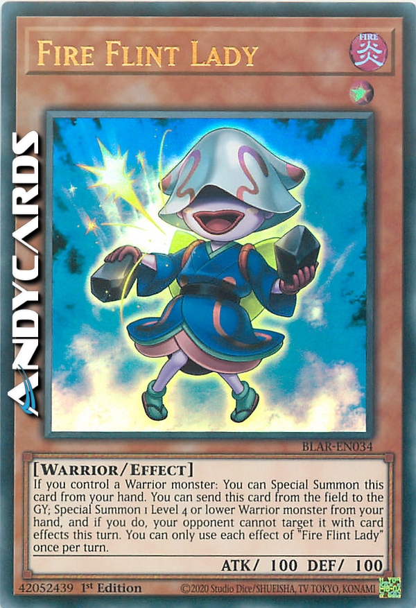 If you control a Warrior monster: You can Special Summon this card from your hand. You can send this card from the field to the GY; Special Summon 1 Level 4 or lower Warrior monster from your hand, and if you do, your opponent cannot target it with card effects this turn. You can only use each effect of "Fire Flint Lady" once per turn.