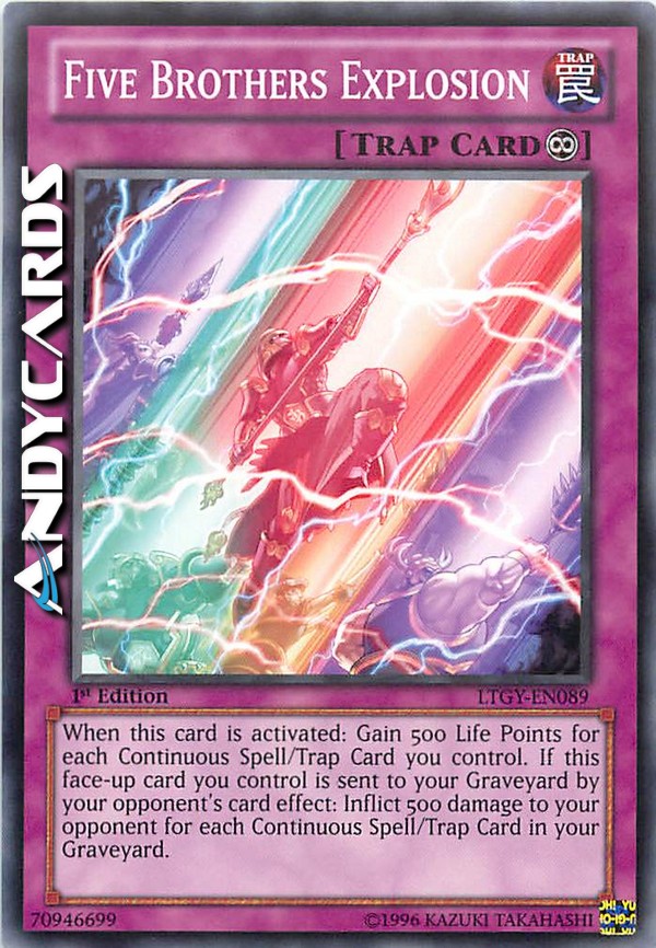Quando questa carta viene attivata: guadagni 500 Life Points per ogni Carta Magia/Trappola Continua che controlli. Se questa carta scoperta che controlli viene mandata al tuo Cimitero dall'effetto di una carta del tuo avversario: infliggi 500 danni al tuo avversario per ogni Carta Magia/Trappola Continua nel tuo Cimitero.