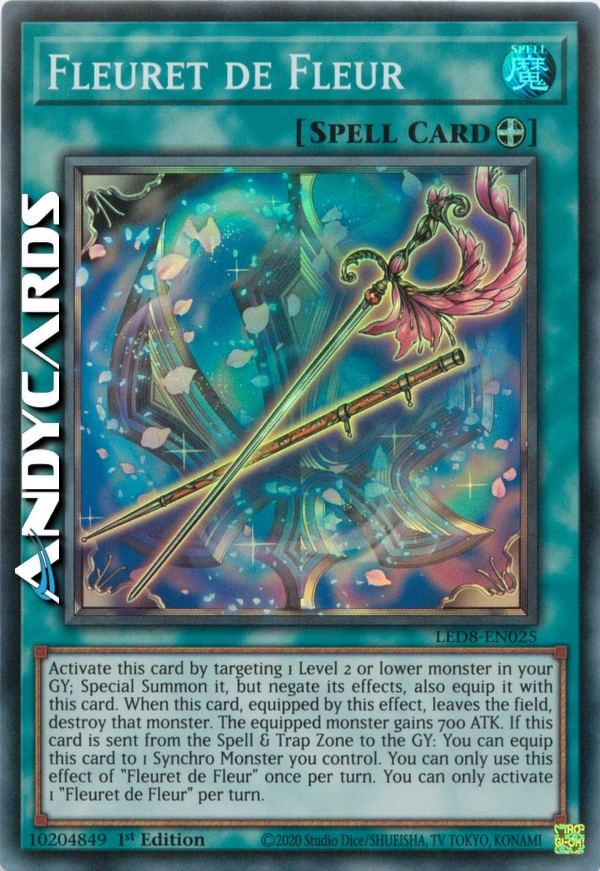 Activate this card by targeting 1 Level 2 or lower monster in your GY; Special Summon it, but negate its effects, also equip it with this card. When this card, equipped by this effect, leaves the field, destroy that monster. The equipped monster gains 700 ATK. If this card is sent from the Spell & Trap Zone to the GY: You can equip this card to 1 Synchro Monster you control. You can only use this effect of "Fleuret de Fleur" once per turn. You can only activate 1 "Fleuret de Fleur" per turn.