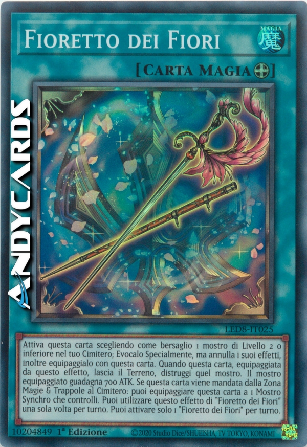 Attiva questa carta scegliendo come bersaglio 1 mostro di Livello 2 o inferiore nel tuo Cimitero; Evocalo Specialmente, ma annulla i suoi effetti, inoltre equipaggialo con questa carta. Quando questa carta, equipaggiata da questo effetto, lascia il Terreno, distruggi quel mostro. Il mostro equipaggiato guadagna 700 ATK. Se questa carta viene mandata dalla Zona Magie & Trappole al Cimitero: puoi equipaggiare questa carta a 1 Mostro Synchro che controlli. Puoi utilizzare questo effetto di "Fioretto dei Fiori" una sola volta per turno. Puoi attivare solo 1 "Fioretto dei Fiori" per turno.