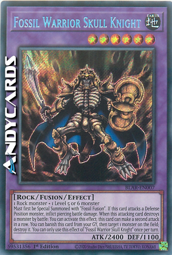 Must first be Special Summoned with "Fossil Fusion". If this card attacks a Defense Position monster, inflict piercing battle damage. When this attacking card destroys a monster by battle: You can activate this effect; this card can make a second attack in a row. You can banish this card from your GY, then target 1 monster on the field; destroy it. You can only use this effect of "Fossil Warrior Skull Knight" once per turn.