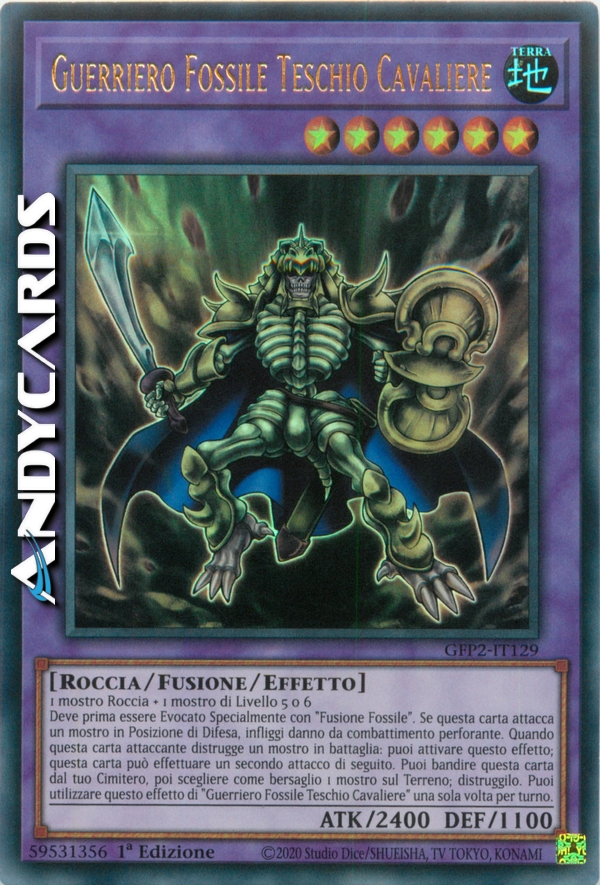 Deve prima essere Evocato Specialmente con "Fusione Fossile". Se questa carta attacca un mostro in Posizione di Difesa, infliggi danno da combattimento perforante. Quando questa carta attaccante distrugge un mostro in battaglia: puoi attivare questo effetto; questa carta può effettuare un secondo attacco di seguito. Puoi bandire questa carta dal tuo Cimitero, poi scegliere come bersaglio 1 mostro sul Terreno; distruggilo. Puoi utilizzare questo effetto di "Guerriero Fossile Teschio Cavaliere" una sola volta per turno.