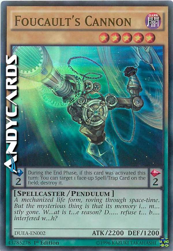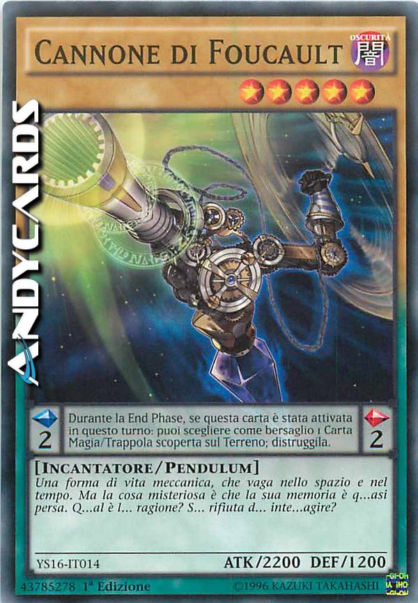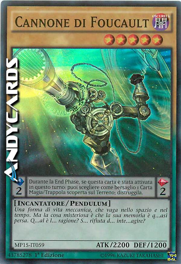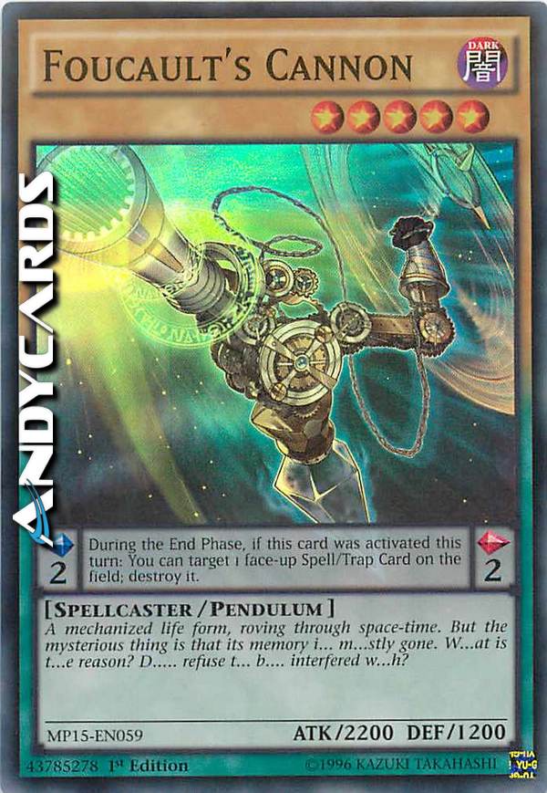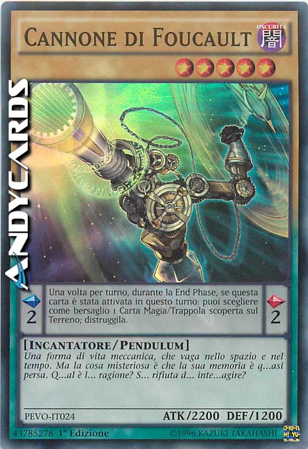 Effetto Pendulum: Una volta per turno, durante la End Phase, se questa carta è stata attivata in questo turno: puoi scegliere come bersaglio 1 Carta Magia/Trappola scoperta sul Terreno; distruggila.