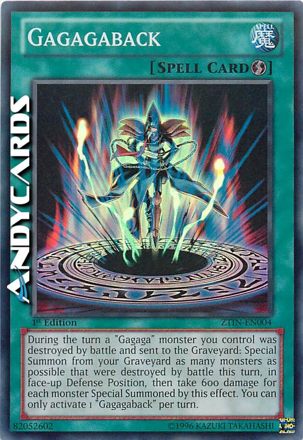 Durante il turno in cui un mostro "Gagaga" che controlli è stato distrutto in battaglia e mandato al Cimitero: Evoca Specialmente dal tuo Cimitero tanti mostri quanti possibile che sono stati distrutti in battaglia in questo turno, scoperti in Posizione di Difesa, poi subisci 600 danni per ogni mostro Evocato Specialmente da questo effetto. Puoi attivare solo 1 "Gagagaritorno" per turno.