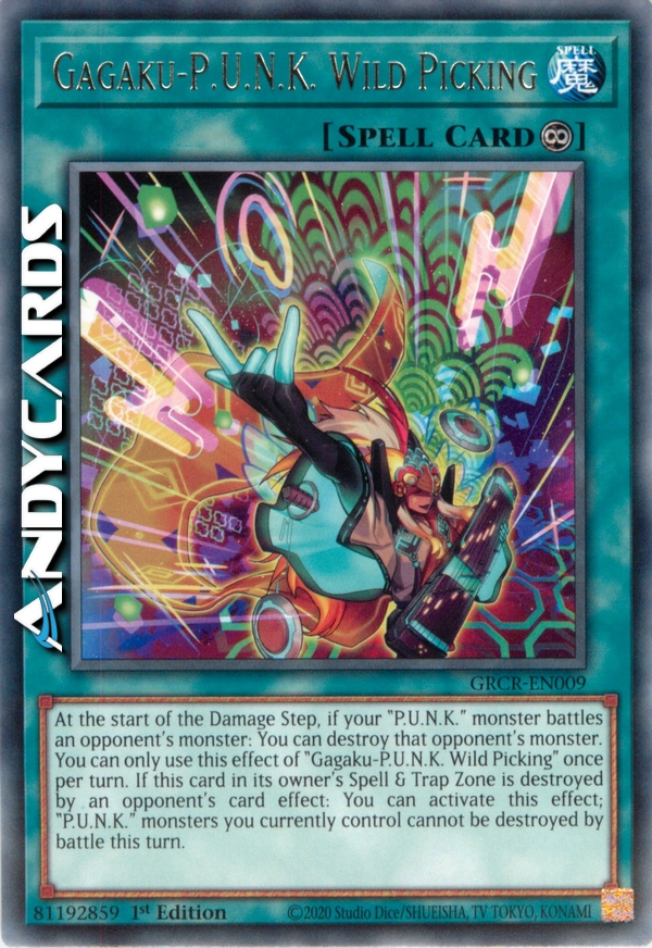 At the start of the Damage Step, if your "P.U.N.K." monster battles an opponent's monster: You can destroy that opponent's monster. You can only use this effect of "Gagaku-P.U.N.K. Wild Picking" once per turn. If this card in its owner's Spell & Trap Zone is destroyed by an opponent's card effect: You can activate this effect; "P.U.N.K." monsters you currently control cannot be destroyed by battle this turn.