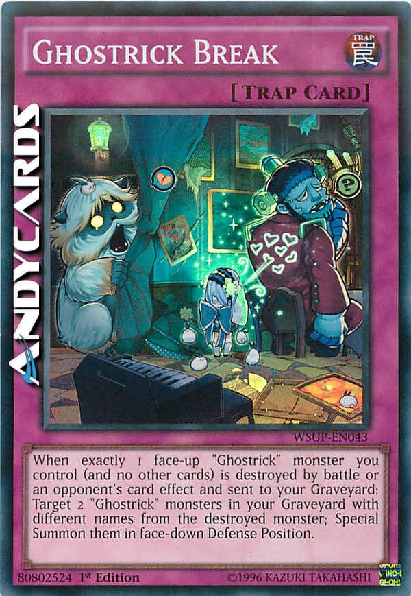 When exactly 1 face-up "Ghostrick" monster you control (and no other cards) is destroyed by battle or an opponent's card effect and sent to your GY: Target 2 "Ghostrick" monsters in your GY with different names from the destroyed monster; Special Summon them in face-down Defense Position.
