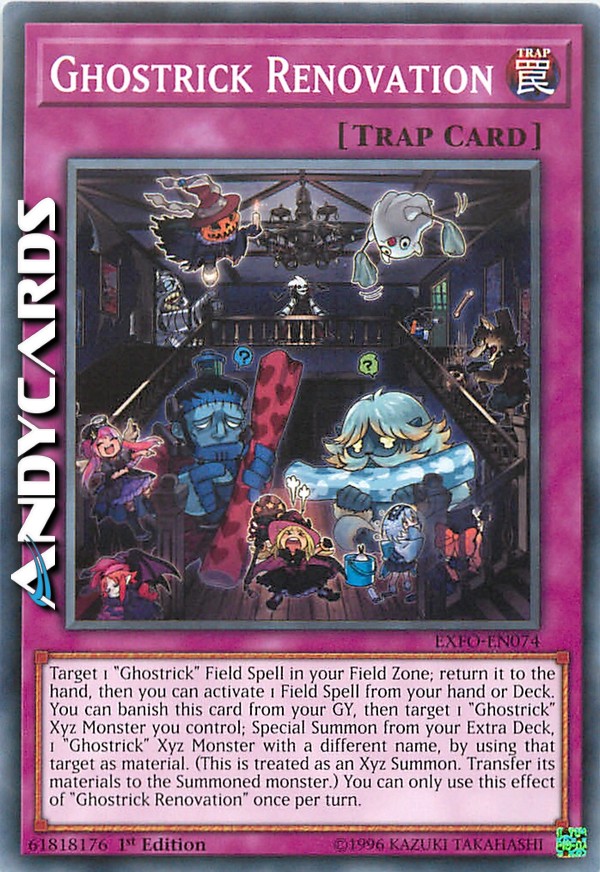 Target 1 "Ghostrick" Field Spell you control; return it to the hand, then you can activate 1 Field Spell from your hand or Deck. You can banish this card from your GY, then target 1 "Ghostrick" Xyz Monster you control; Special Summon 1 "Ghostrick" Xyz Monster from your Extra Deck with a different name, by using that target as material. (This is treated as an Xyz Summon. Transfer that target's materials to the Summoned monster.) You can only use this effect of "Ghostrick Renovation" once per turn.