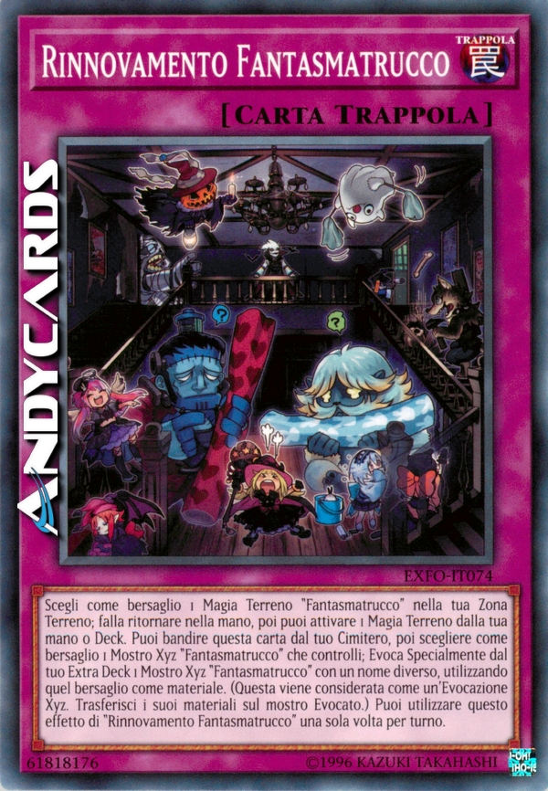 Scegli come bersaglio 1 Magia Terreno "Fantasmatrucco" nella tua Zona Terreno; falla ritornare nella mano, poi puoi attivare 1 Magia Terreno dalla tua mano o Deck. Puoi bandire questa carta dal tuo Cimitero, poi scegliere come bersaglio 1 Mostro Xyz "Fantasmatrucco" che controlli; Evoca Specialmente dal tuo Extra Deck 1 Mostro Xyz "Fantasmatrucco" con un nome diverso, utilizzando quel bersaglio come materiale. (Questa viene considerata come un'Evocazione Xyz. Trasferisci i suoi materiali sul mostro Evocato.) Puoi utilizzare questo effetto di "Rinnovamento Fantasmatrucco" una sola volta per turno.