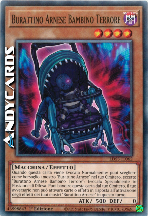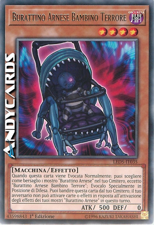Quando questa carta viene Evocata Normalmente: puoi scegliere come bersaglio 1 mostro "Burattino Arnese" nel tuo Cimitero, eccetto "Burattino Arnese Bambino Terrore"; Evocalo Specialmente in Posizione di Difesa. Puoi bandire questa carta dal tuo Cimitero; il tuo avversario non può attivare carte o effetti in risposta all'attivazione degli effetti dei tuoi mostri "Burattino Arnese" in questo turno.