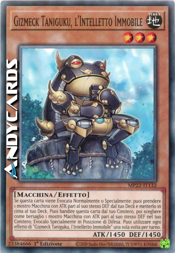Se questa carta viene Evocata Normalmente o Specialmente: puoi prendere 1 mostro Macchina con ATK pari al suo stesso DEF dal tuo Deck e metterlo in cima al tuo Deck. Puoi bandire questa carta dal tuo Cimitero, poi scegliere come bersaglio 1 mostro Macchina con ATK pari al suo stesso DEF nel tuo Cimitero; Evocalo Specialmente in Posizione di Difesa. Puoi utilizzare ogni effetto di "Gizmeck Taniguku, l'Intelletto Immobile" una sola volta per turno.