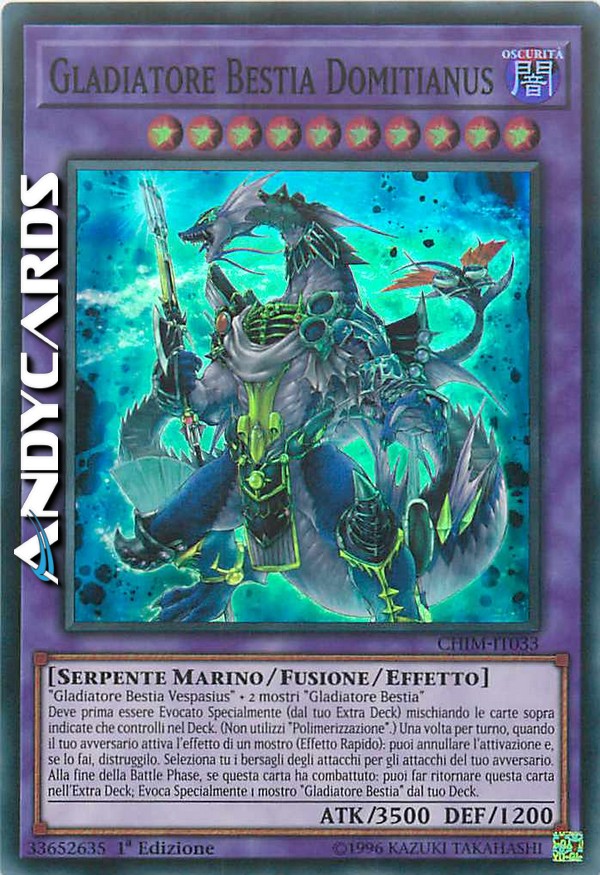 Deve prima essere Evocato Specialmente (dal tuo Extra Deck) mischiando le carte sopra indicate che controlli nel Deck. (Non utilizzi "Polimerizzazione".) Una volta per turno, quando il tuo avversario attiva l'effetto di un mostro (Effetto Rapido): puoi annullare l'attivazione e, se lo fai, distruggilo. Seleziona tu i bersagli degli attacchi per gli attacchi del tuo avversario. Alla fine della Battle Phase, se questa carta ha combattuto: puoi far ritornare questa carta nell'Extra Deck; Evoca Specialmente 1 mostro "Gladiatore Bestia" dal tuo Deck.