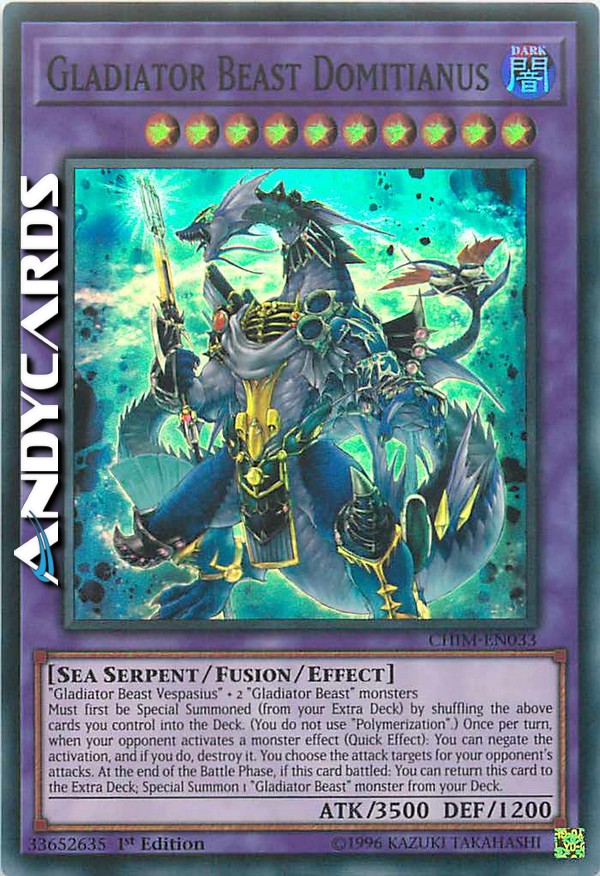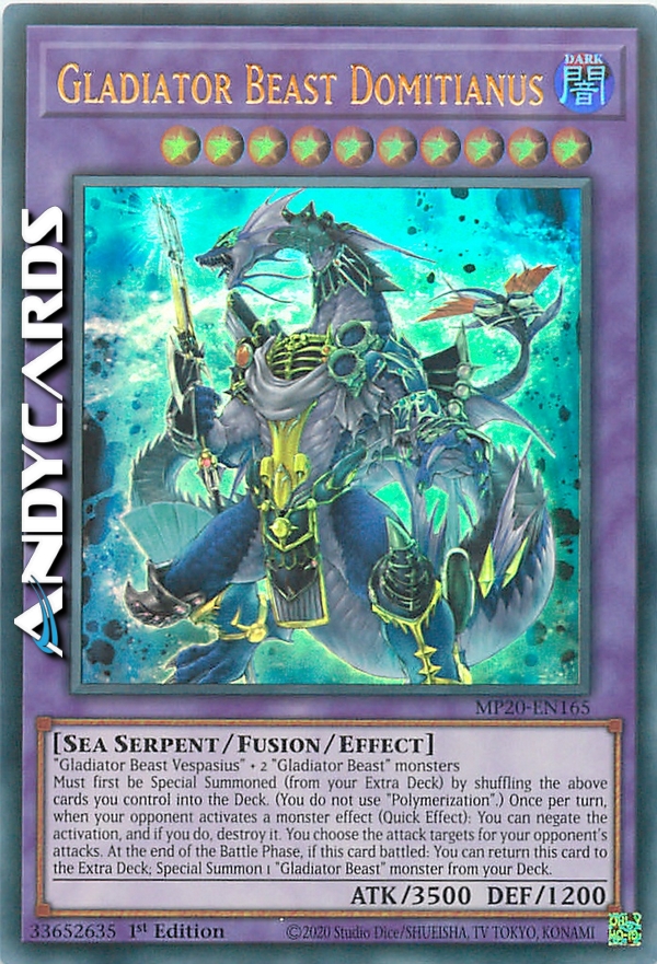 Must first be Special Summoned (from your Extra Deck) by shuffling the above cards you control into the Deck. (You do not use "Polymerization".) Once per turn, when your opponent activates a monster effect (Quick Effect): You can negate the activation, and if you do, destroy it. You choose the attack targets for your opponent's attacks. At the end of the Battle Phase, if this card battled: You can return this card to the Extra Deck; Special Summon 1 "Gladiator Beast" monster from your Deck.
