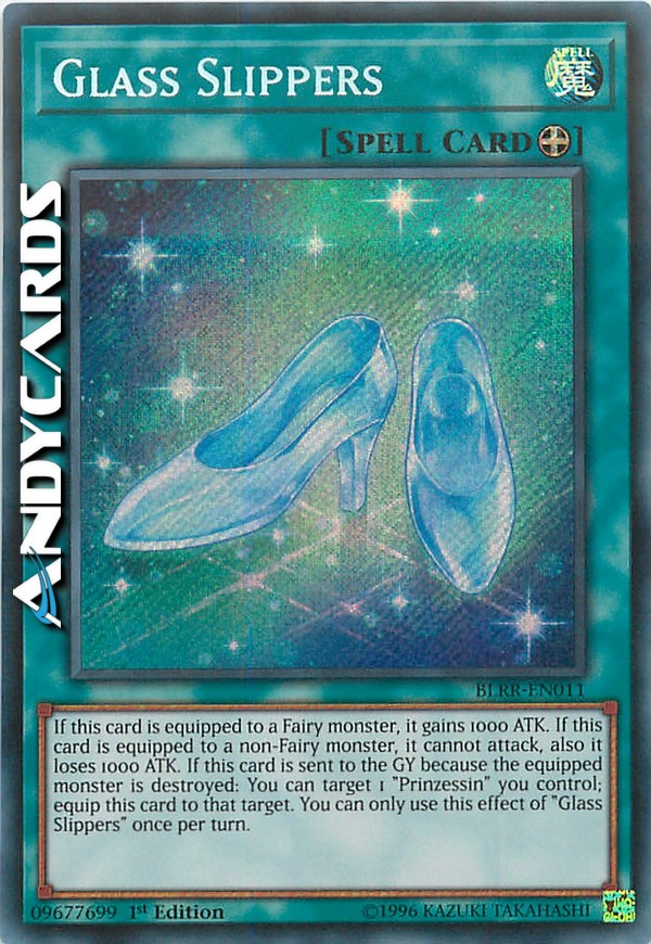 Se questa carta viene equipaggiata a un mostro Fata, esso guadagna 1000 ATK. Se questa carta viene equipaggiata a un mostro non-Fata, esso non può attaccare, inoltre esso perde 1000 ATK. Se questa carta viene mandata al Cimitero perché il mostro equipaggiato viene distrutto: puoi scegliere come bersaglio 1 "Prinzessin" che controlli; equipaggia questa carta a quel bersaglio. Puoi utilizzare questo effetto di "Scarpette di Vetro" una sola volta per turno.