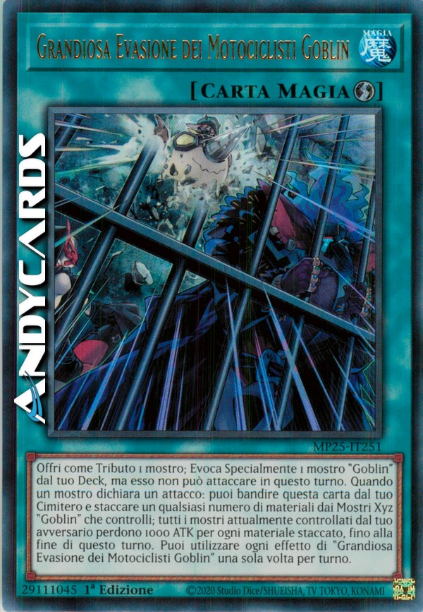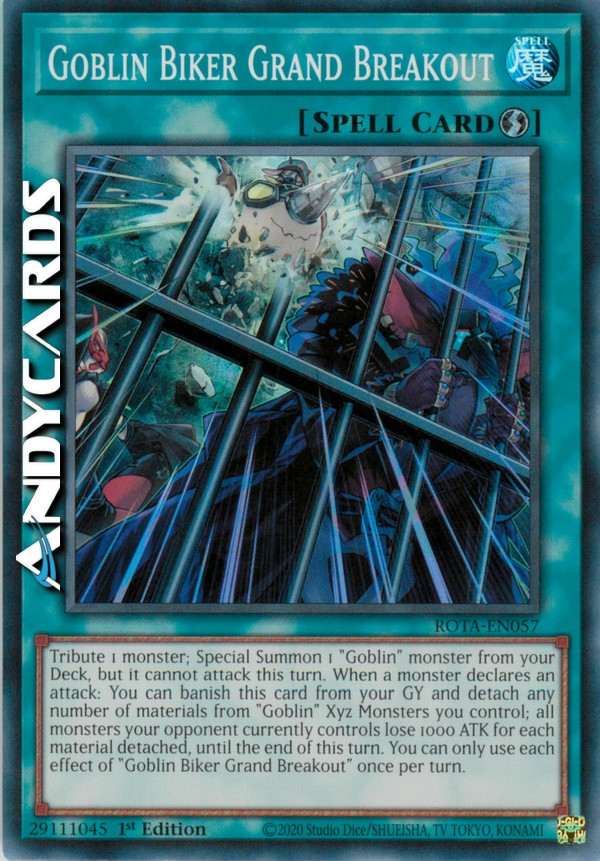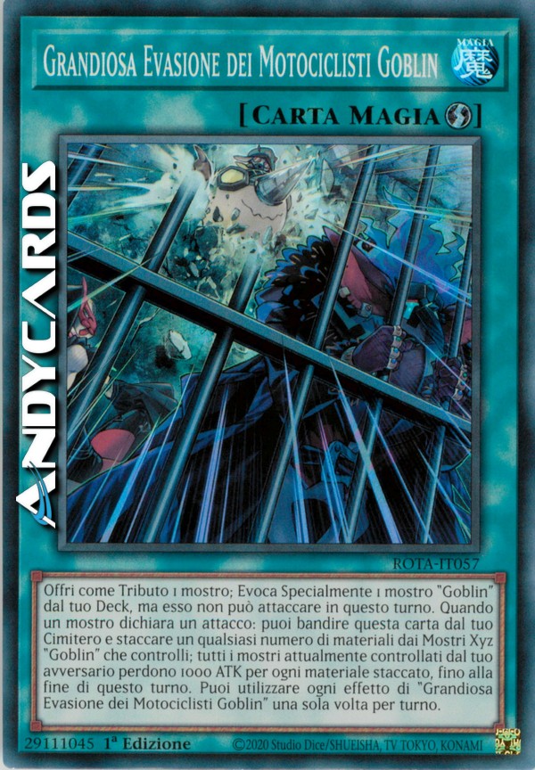 Offri come Tributo 1 mostro; Evoca Specialmente 1 mostro "Goblin" dal tuo Deck, ma esso non può attaccare in questo turno. Quando un mostro dichiara un attacco: puoi bandire questa carta dal tuo Cimitero e staccare un qualsiasi numero di materiali dai Mostri Xyz "Goblin" che controlli; tutti i mostri attualmente controllati dal tuo avversario perdono 1000 ATK per ogni materiale staccato, fino alla fine di questo turno. Puoi utilizzare ogni effetto di "Grandiosa Evasione dei Motociclisti Goblin" una sola volta per turno.