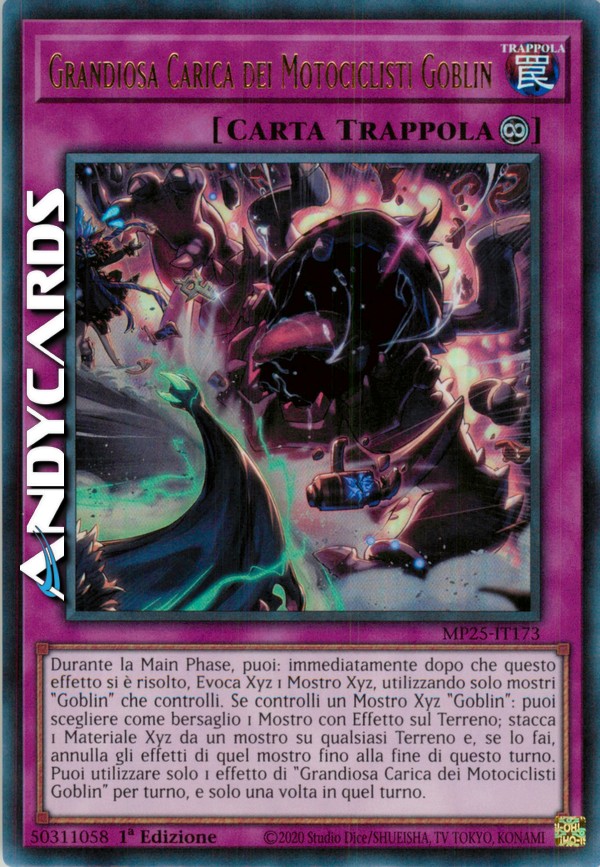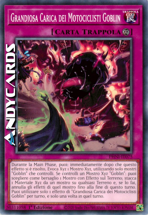 Durante la Main Phase, puoi: immediatamente dopo che questo effetto si è risolto, Evoca Xyz 1 Mostro Xyz, utilizzando solo mostri "Goblin" che controlli. Se controlli un Mostro Xyz "Goblin": puoi scegliere come bersaglio 1 Mostro con Effetto sul Terreno; stacca 1 Materiale Xyz da un mostro su qualsiasi Terreno e, se lo fai, annulla gli effetti di quel mostro fino alla fine di questo turno. Puoi utilizzare solo 1 effetto di "Grandiosa Carica dei Motociclisti Goblin" per turno, e solo una volta in quel turno.