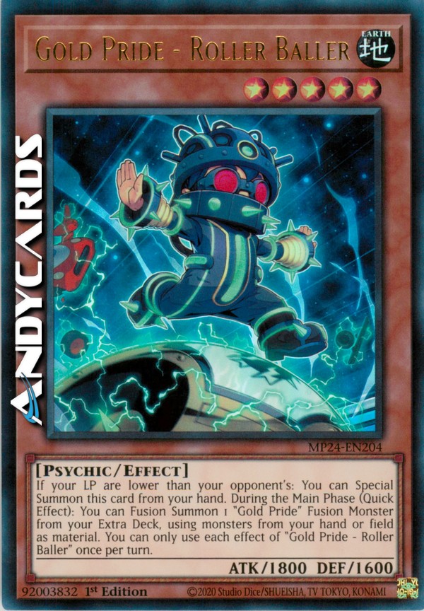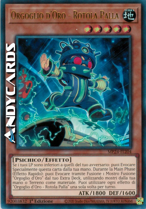 Se i tuoi LP sono inferiori a quelli del tuo avversario: puoi Evocare Specialmente questa carta dalla tua mano. Durante la Main Phase (Effetto Rapido): puoi Evocare tramite Fusione 1 Mostro Fusione "Orgoglio d'Oro" dal tuo Extra Deck, utilizzando mostri dalla tua mano o Terreno come materiale. Puoi utilizzare ogni effetto di "Orgoglio d'Oro - Rotola Palla" una sola volta per turno.