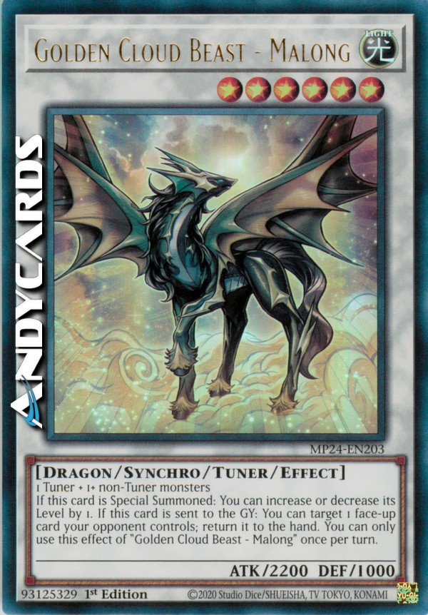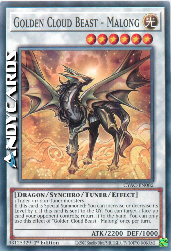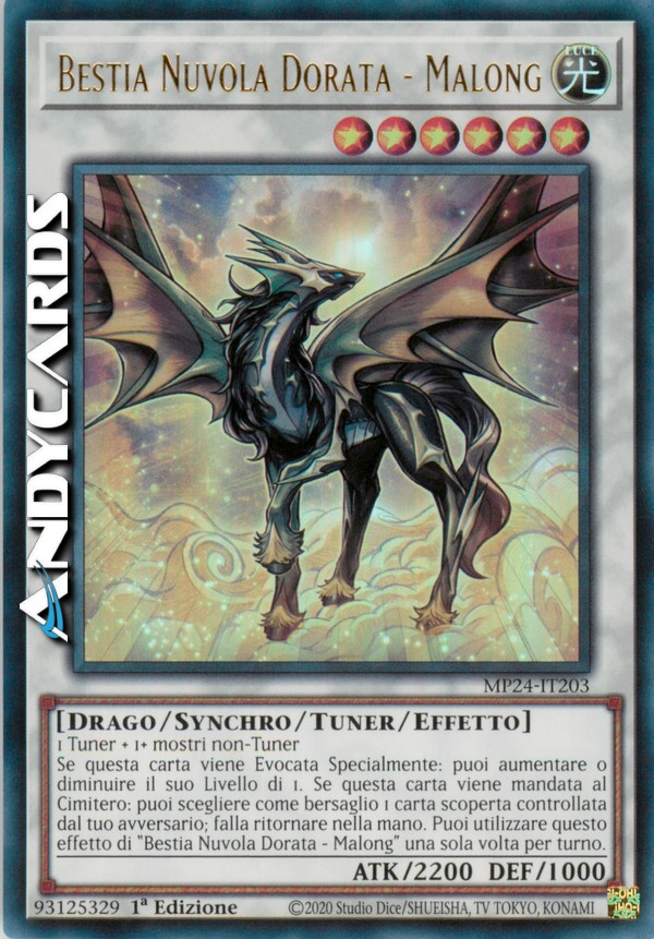Se questa carta viene Evocata Specialmente: puoi aumentare o diminuire il suo Livello di 1. Se questa carta viene mandata al Cimitero: puoi scegliere come bersaglio 1 carta scoperta controllata dal tuo avversario; falla ritornare nella mano. Puoi utilizzare questo effetto di "Bestia Nuvola Dorata - Malong" una sola volta per turno.