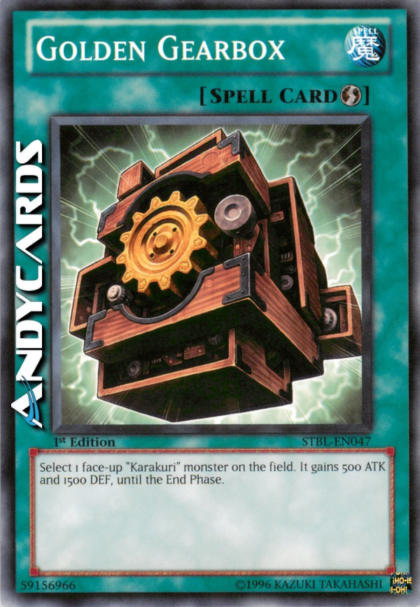 Scegli 1 mostro "Karakuri" scoperto sul Terreno. Esso guadagna 500 ATK e 1500 DEF, fino alla End Phase.