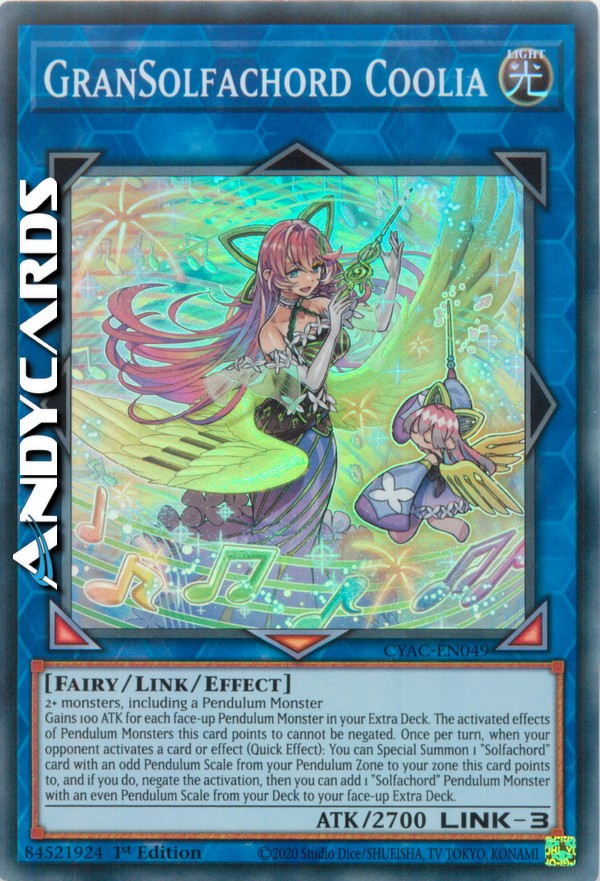 Guadagna 100 ATK per ogni Mostro Pendulum scoperto nel tuo Extra Deck. Gli effetti attivati dei Mostri Pendulum puntati da questa carta non possono essere annullati. Una volta per turno, quando il tuo avversario attiva una carta o un effetto (Effetto Rapido): puoi Evocare Specialmente 1 carta "Solfaccordo" con un Valore Pendulum dispari dalla tua Zona Pendulum in una tua zona puntata da questa carta e, se lo fai, annulla l'attivazione, poi puoi aggiungere 1 Mostro Pendulum "Solfaccordo" con un Valore Pendulum pari dal tuo Deck al tuo Extra Deck scoperto.