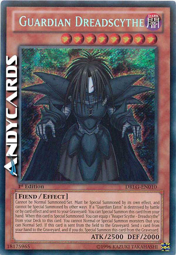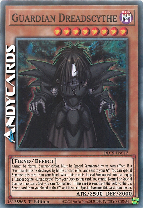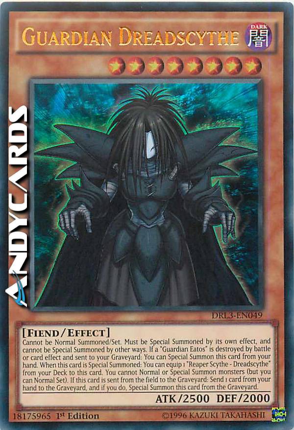 Cannot be Normal Summoned/Set. Must be Special Summoned by its own effect, and cannot be Special Summoned by other ways. If a "Guardian Eatos" is destroyed by battle or card effect and sent to your Graveyard: You can Special Summon this card from your hand. When this card is Special Summoned: You can equip 1 "Reaper Scythe - Dreadscythe" from your Deck to this card. You cannot Normal or Special Summon monsters (but you can Normal Set). If this card is sent from the field to the Graveyard: Send 1 card from your hand to the Graveyard, and if you do, Special Summon this card from the Graveyard.